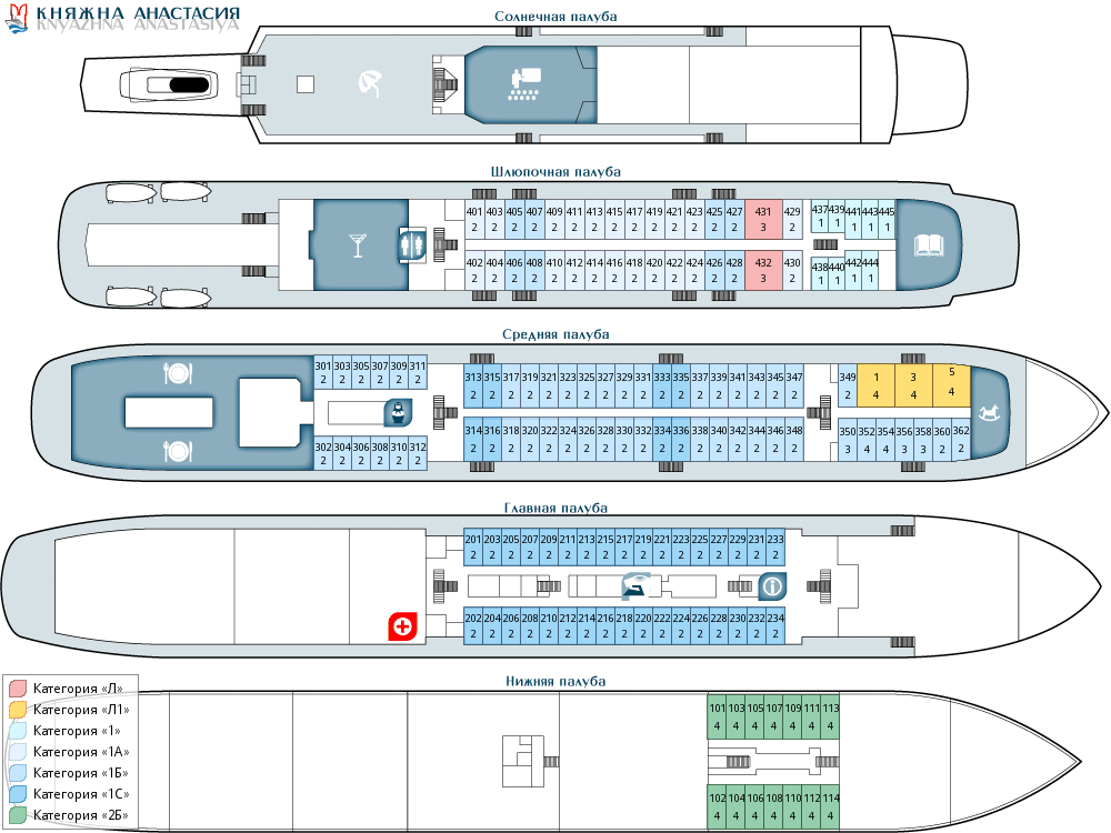 Четырехместная двухъярусная каюта со всеми удобствами на средней палубе. В каюте: санблок (душ, умывальник, туалет), кондиционер, телевизор, холодильник, фен, электророзетка 220В. Каюты №: 352, 354.
