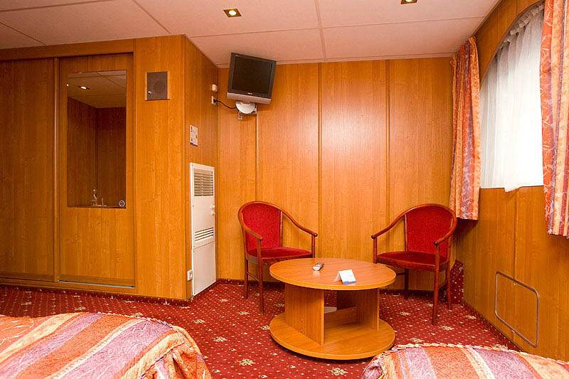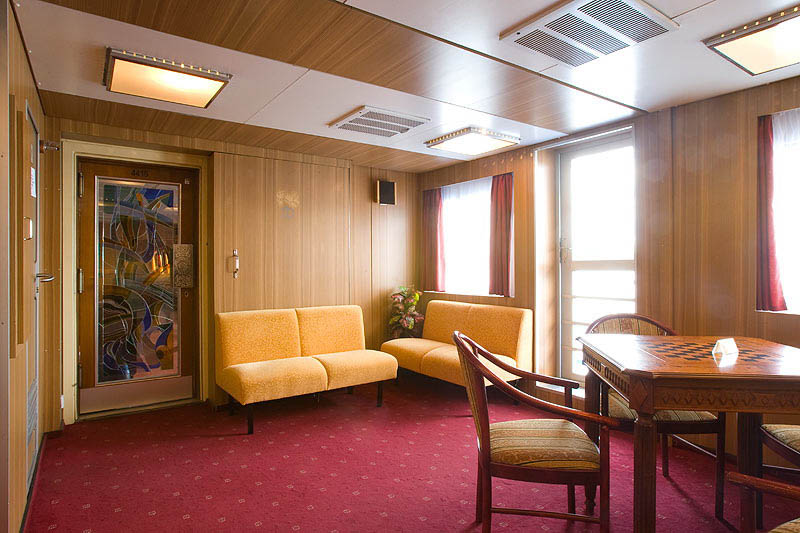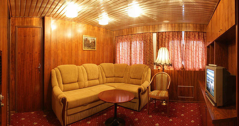 Двухместная двухкомнатная каюта со всеми удобствами на шлюпочной палубе. В каюте: В каюте: двуспальная кровать, угловой диван, журнальный столик, небольшая кухня, холодильник, телевизор, санблок, кондиционер, фен, электророзетка 220В. Возможно размещение третьего человека на дополнительном месте. Каюты №: 431, 432.