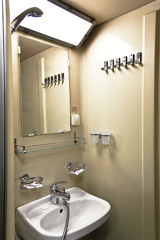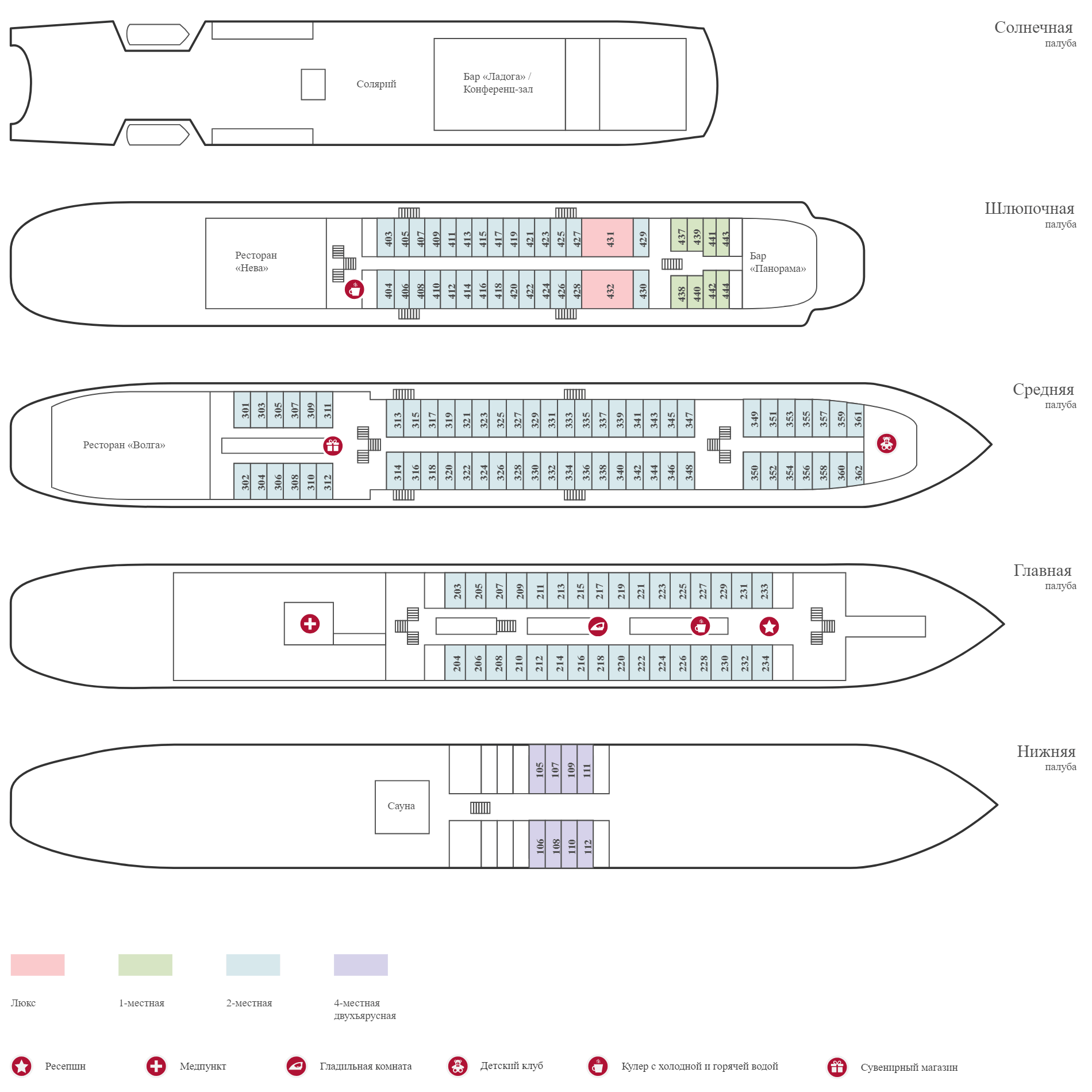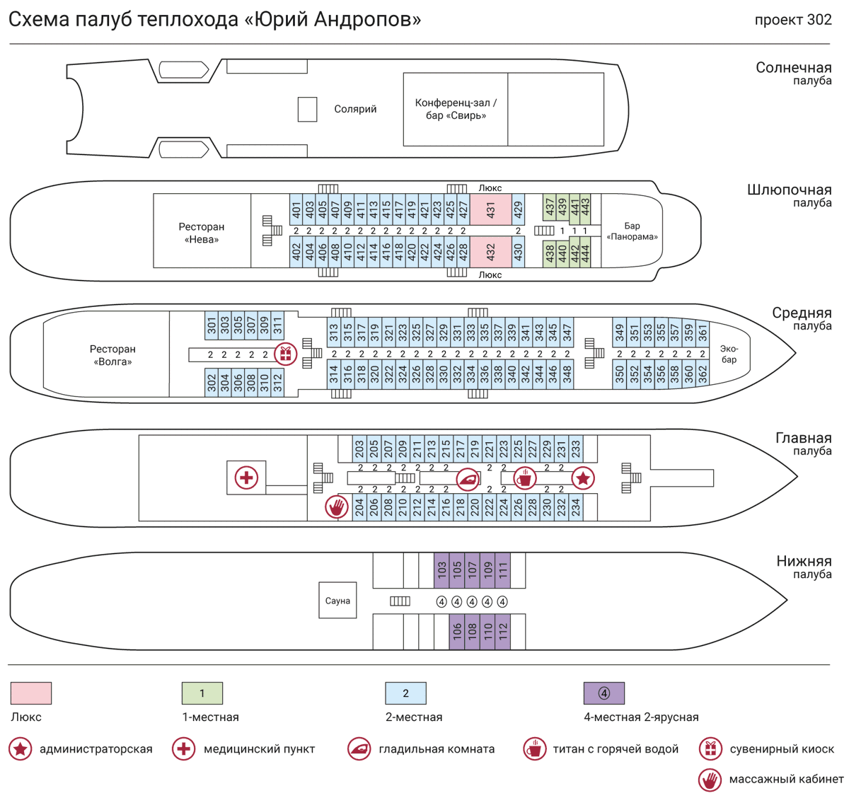 Во всех каютах: шкаф для одежды, радио, кондиционер, душ, санузел, обзорное окно (на нижней палубе – иллюминаторы), электророзетка 220V.