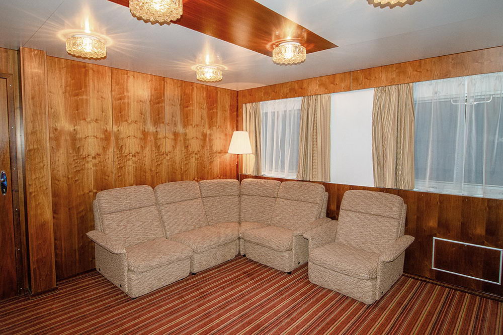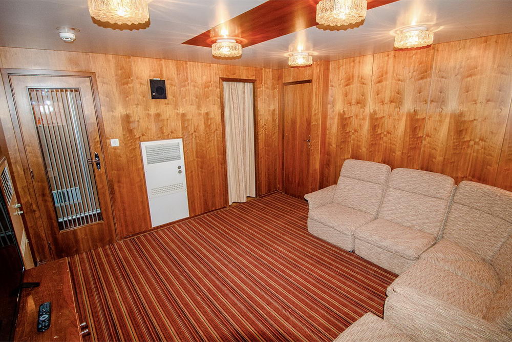 Двухкомнатная каюта с удобствами (душ, санузел, кондиционер), на шлюпочной палубе. Каюта рассчитана на размещение от 2 до 4 человек. В гостиной: мягкая мебель (кресло и раскладывающийся диван), журнальный столик, шкафы для одежды, телевизор, холодильник, фен, чайник, телефон, радио, два обзорных окна, электророзетка на 220V. В спальне: двуспальная кровать, обзорное окно. Каюты №: 431, 432.