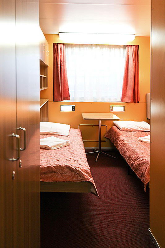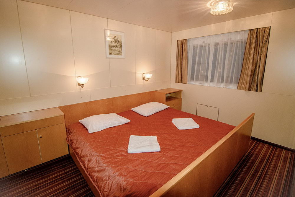Двухместная одноярусная каюта на средней палубе. В каюте: два спальных места, шкаф для одежды, радио, душ, санузел, кондиционер, обзорное окно, электророзетка на 220V. Каюты №: 301-362.