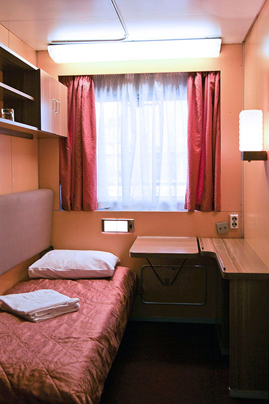Одноместная каюта на шлюпочной палубе. В каюте: одно спальное место, шкаф для одежды, радио, душ, санузел, кондиционер, обзорное окно, электророзетка на 220V. Каюты №: 437-444.