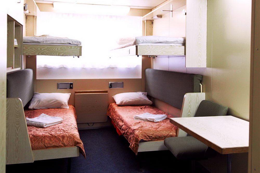 Четырехместная двухъярусная каюта на нижней палубе. В каюте: четыре спальных места (два внизу, два вторым ярусом), шкаф для одежды, радио, душ, санузел, кондиционер, два иллюминатора, электророзетка на 220V. Каюты №: 103, 105-112.