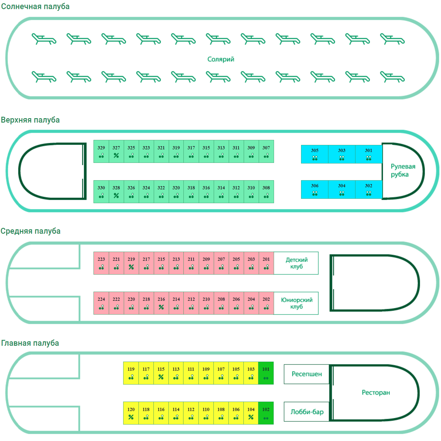 Двухместная каюта Делюкс на верхней палубе. В каюте: двуспальная кровать (в каютах № 327, 328 — две односпальные кровати), холодильник, кондиционер, сейф, телевизор, совмещенный санузел с душевой кабиной (включены халат, фен). Каюты № 329, 330 шумные. Возможно размещение третьего человека на дополнительном месте (кресло-кровать). Каюты №: 307-330.
