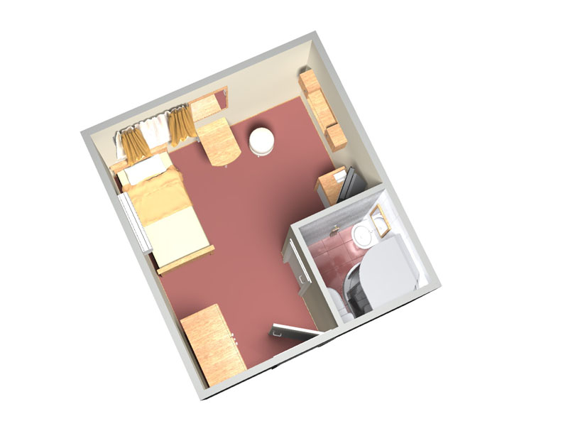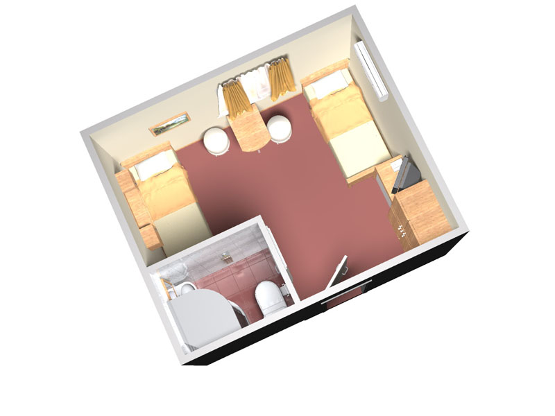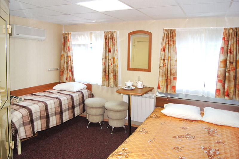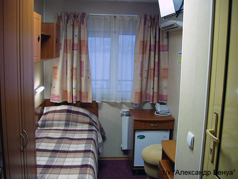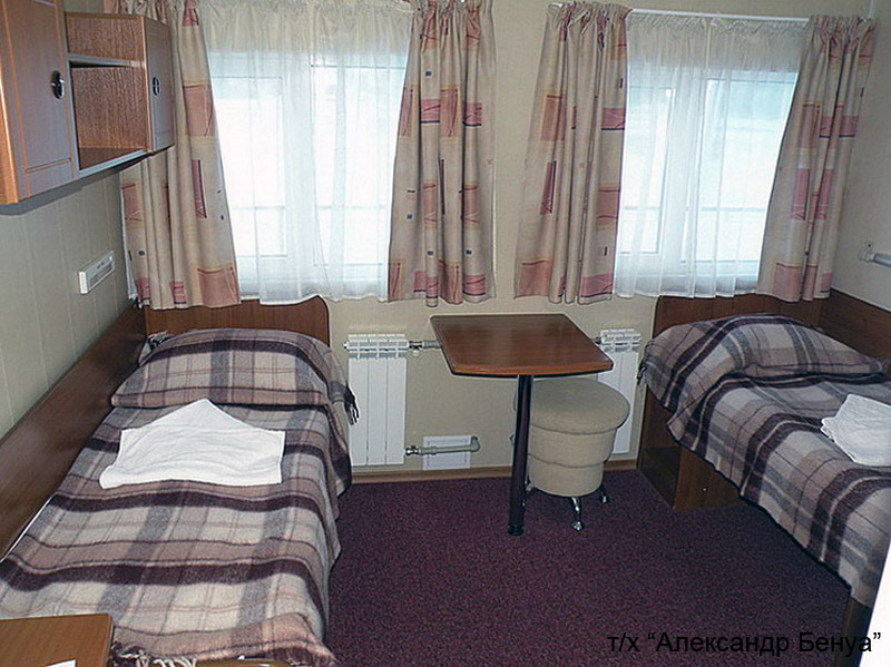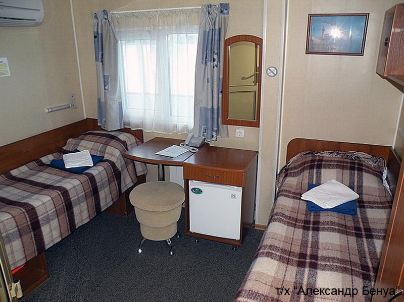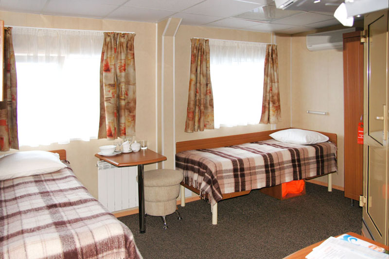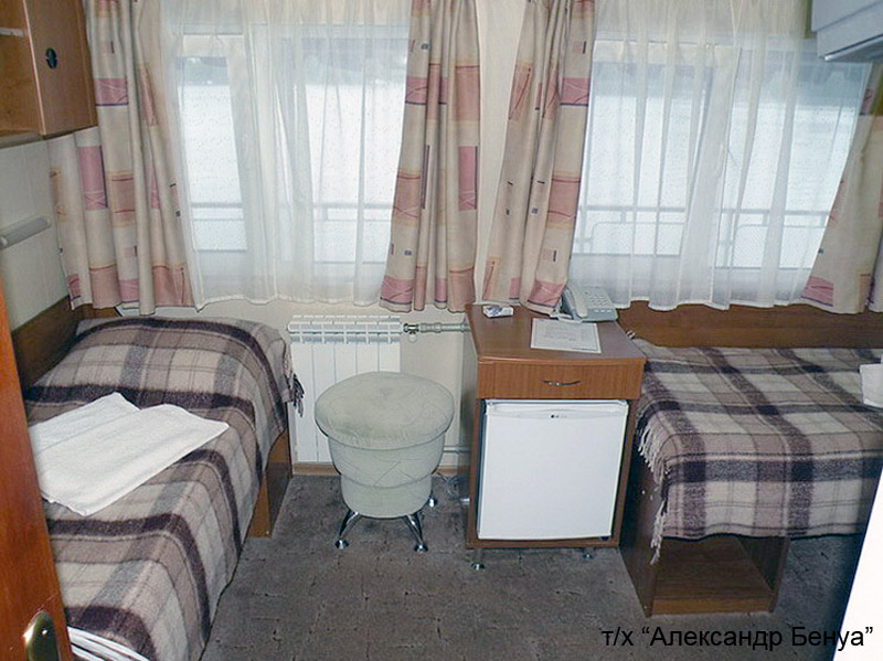 Каюты 402, 404–410 – двухместная каюта увеличенной площади, со всеми удобствами (раковина, душевая кабина, туалет, кондиционер) расположенная на шлюпочной палубе. Площадь каюты 13.4 кв.м. В каюте: двуспальная кровать (при необходимости трансформируется в две односпальные кровати), шкаф, прикроватные тумбы, кресло, туалетный стол, настенная вешалка для одежды, телевизор с кабельным и спутниковым вещанием, холодильник, сейф, телефон внутренней связи, розетки 220V, фен, плед для каждого туриста, обзорное окно, персональный балкон с мебелью для отдыха.