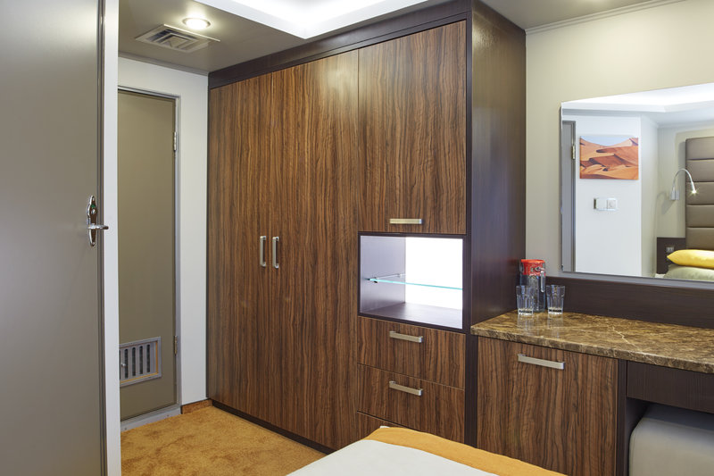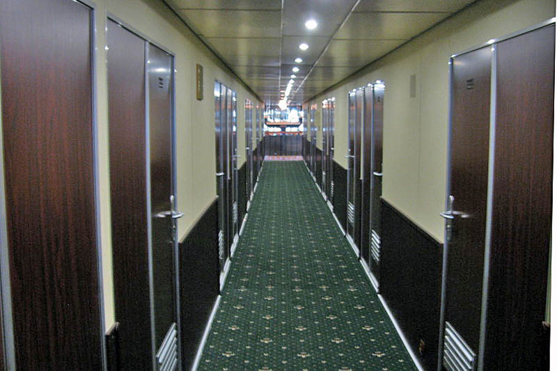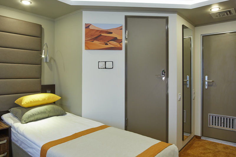 Для размещения туристов предусмотрены 1-, 2- и 3-х местные каюты на шлюпочной, средней, главной и нижней палубах. Имеются каюты повышенной комфортности - "Люкс" и "Полулюкс". В каждой каюте: душ, туалет, кондиционер, холодильник, шкаф, телевизор, фен, радиоточка, электрическая розетка 220В, внутренняя телефонная связь, ROOM-сервис.