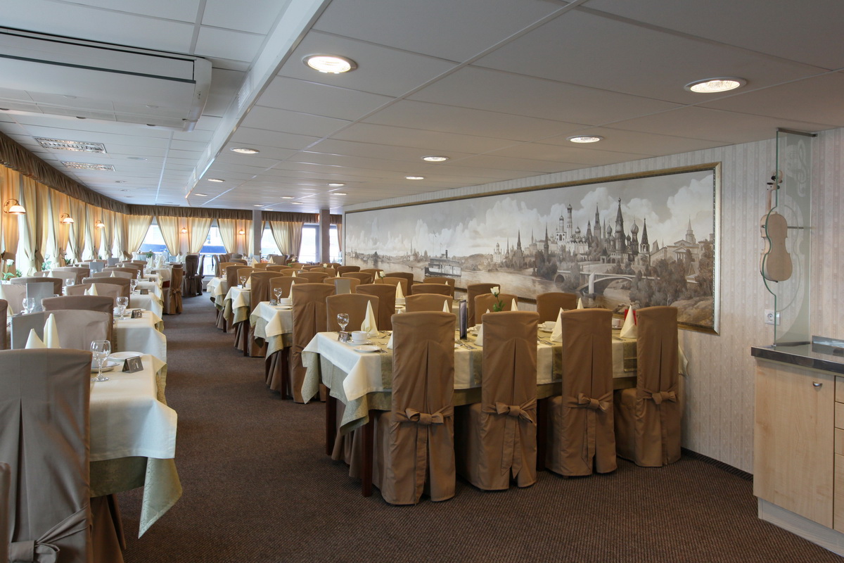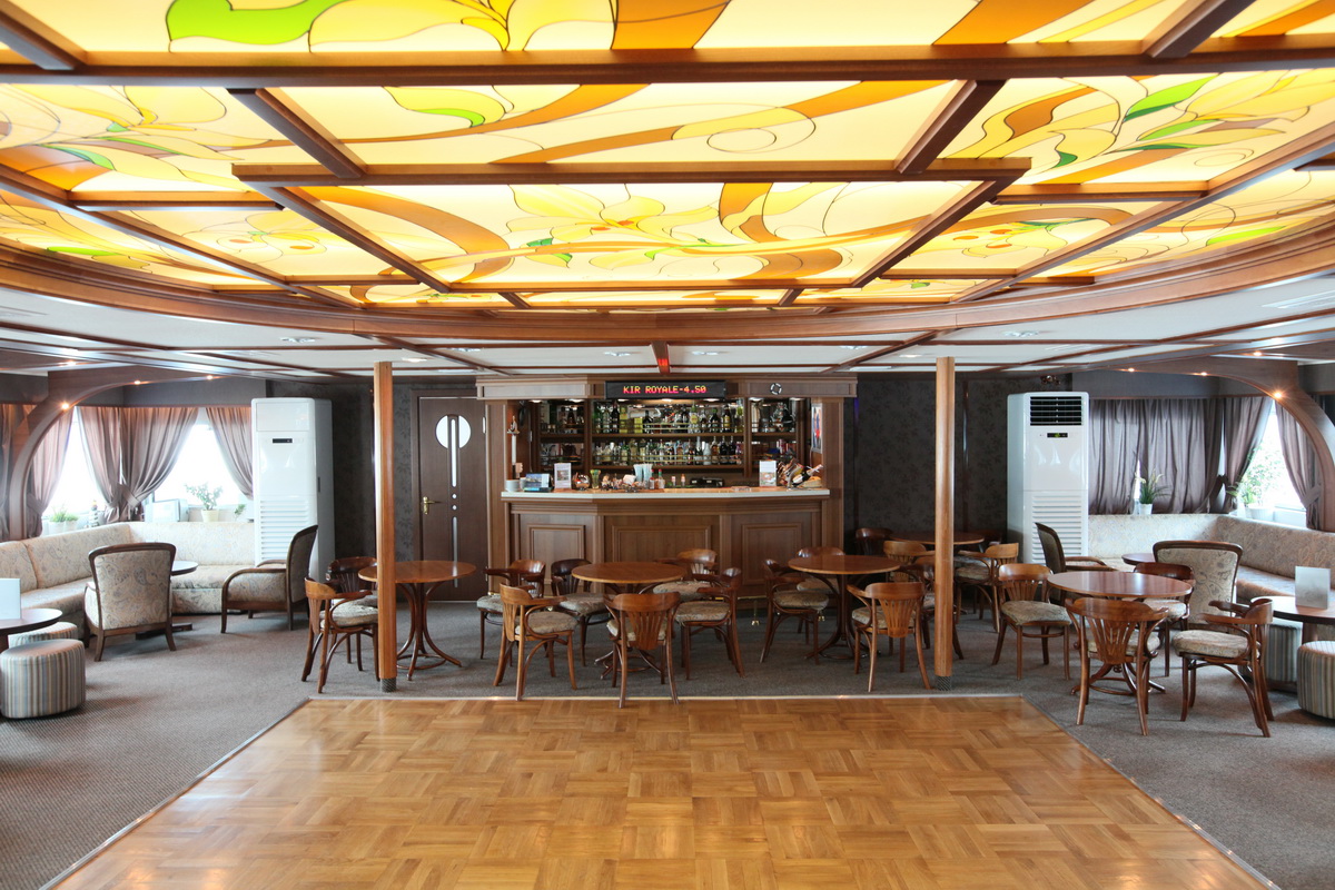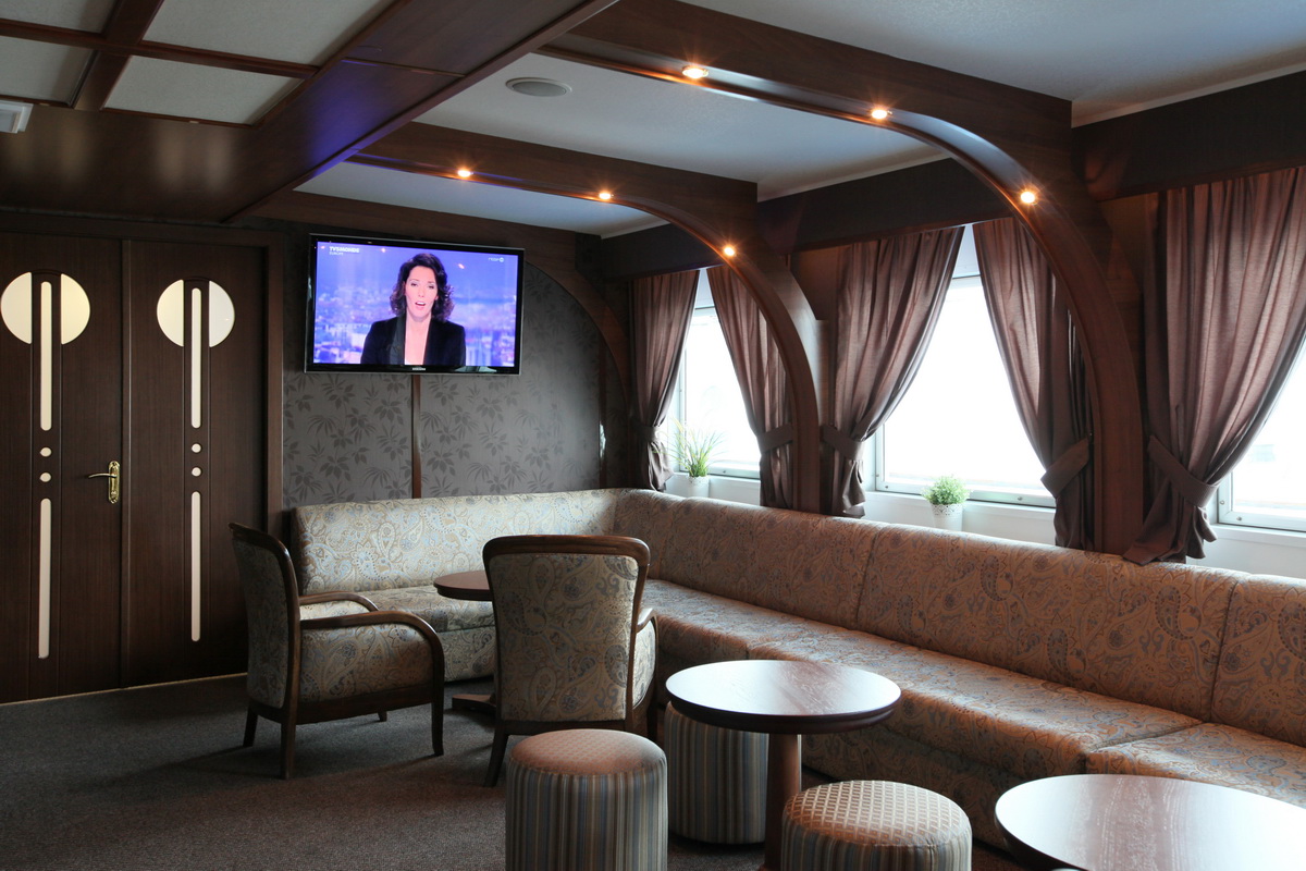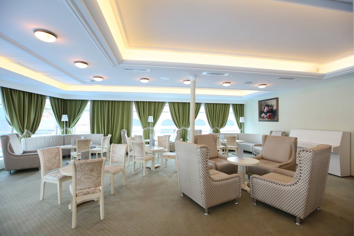 Теплоход полностью отвечает критериям комфорта самых требовательных гостей: огромный ресторан с панорамным видом, два оригинально декорированных бара, удобный конференц-зал, минималистский дизайн интерьера, увеличение пространства, снижение пассажировместимости (207 человек вместо 260), сувенирный магазин, прачечная и кабинет доктора. Каждая каюта оборудована панорамным открывающимся окном, двумя одноуровневыми кровати, телевизором с плоским экраном, феном, сейфом, платяным шкафом.