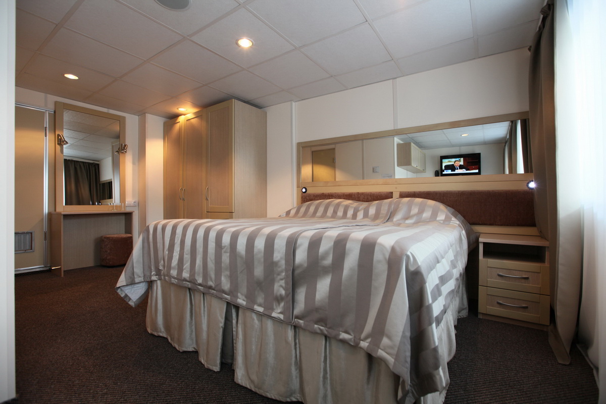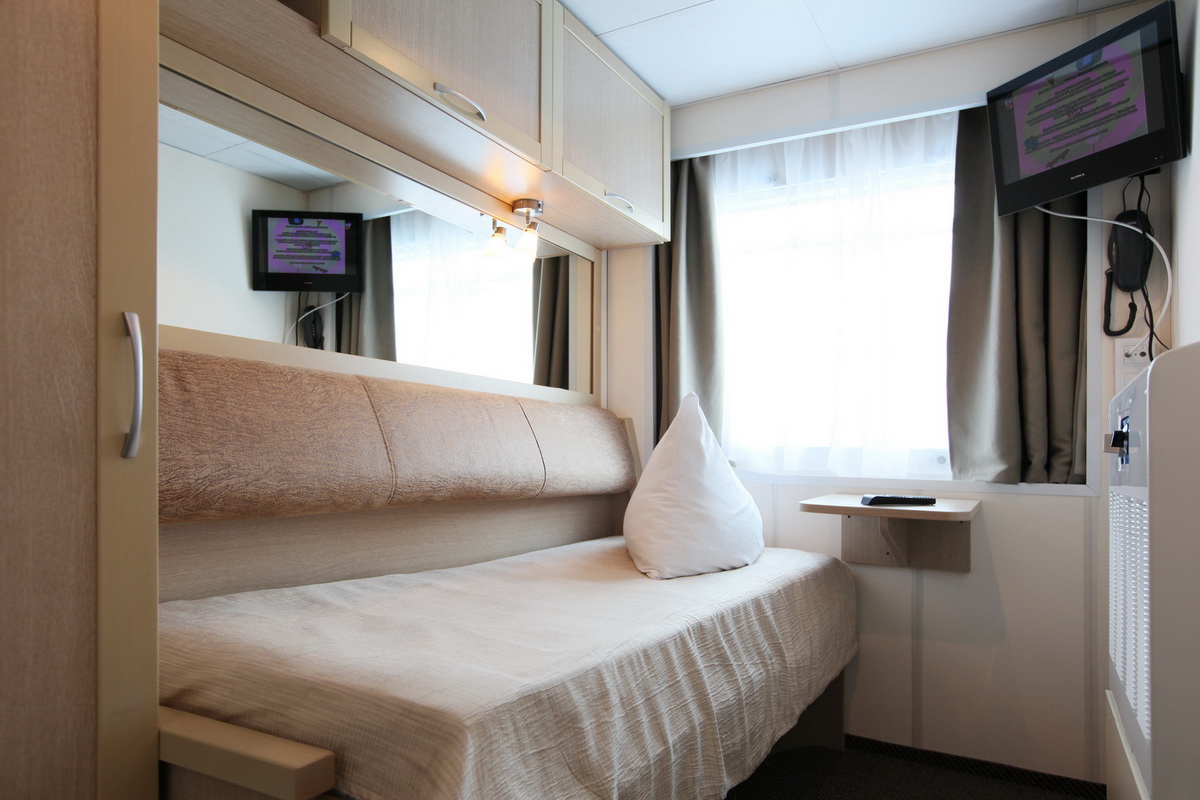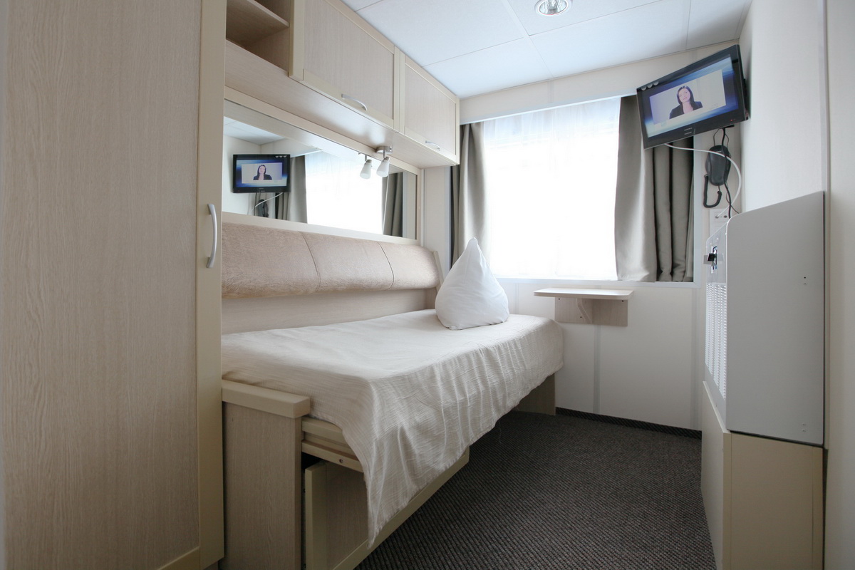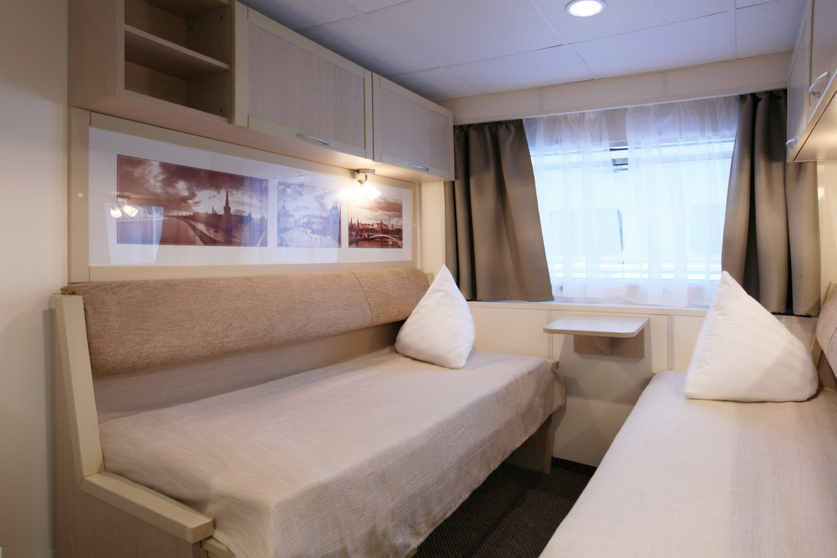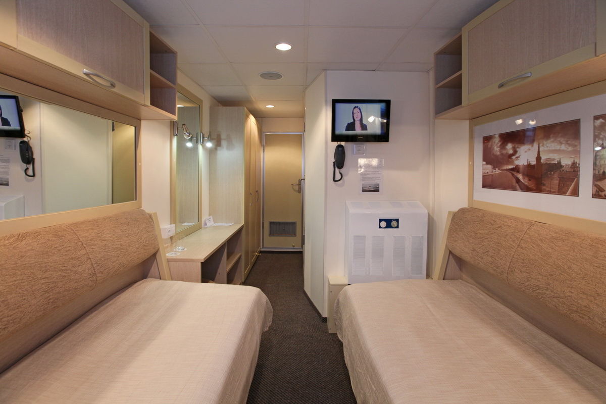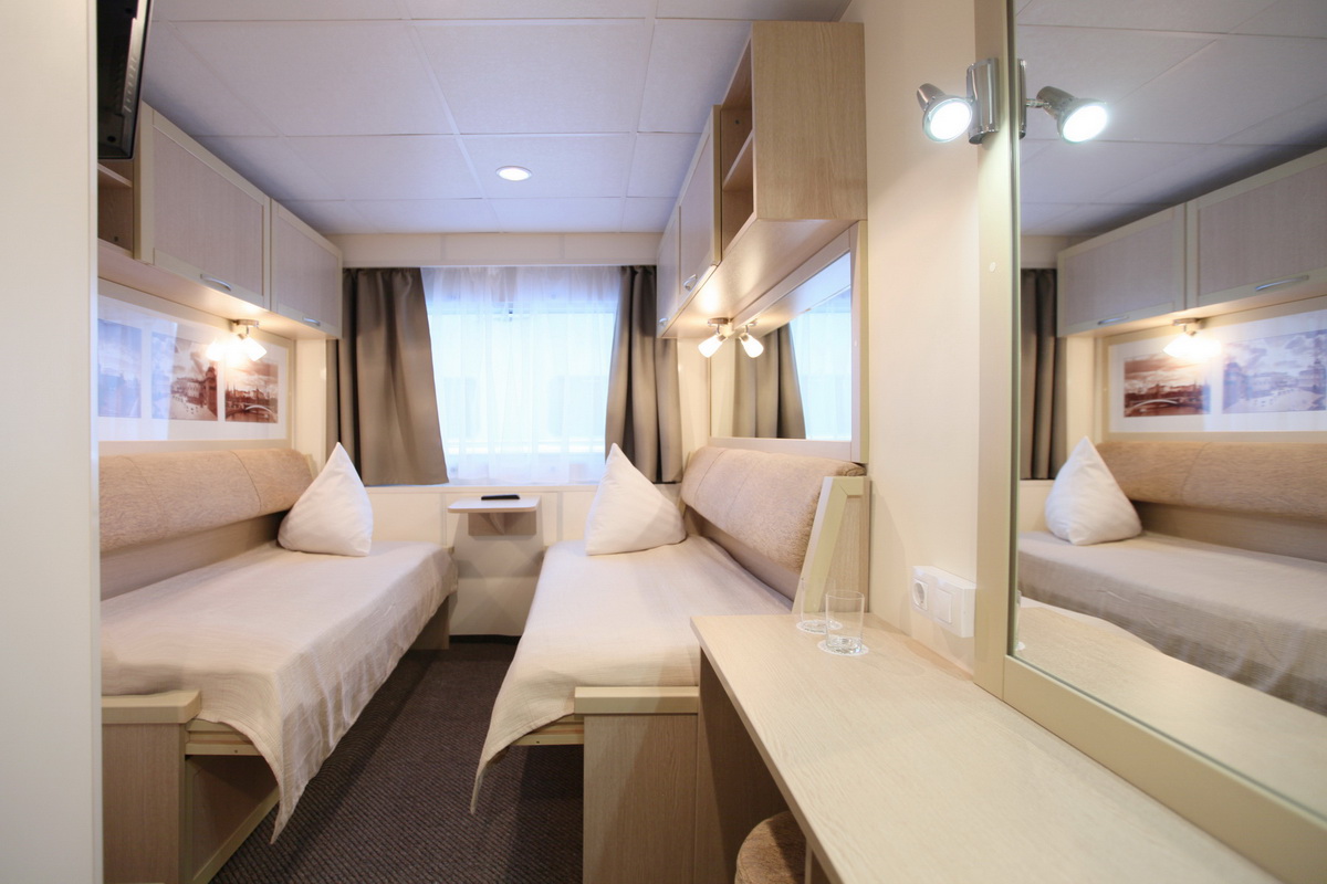 Двухместная одноярусная каюта со всеми удобствами, расположенная на нижней палубе. В каюте: два иллюминатора (не открываются), две односпальные кровати, кондиционер, телевизор, сейф, внутренний телефон, душ, санузел, фен, туалетные принадлежности, полотенца. Каюты №: 118, 120.