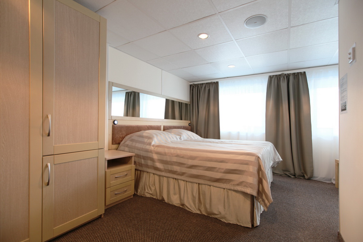 Двухместная однокомнатная каюта со всеми удобствами, расположенная на средней палубе. В каюте: два больших открывающихся обзорных окна, двуспальная кровать (можно раздвинуть), кондиционер, телевизор, сейф, внутренний телефон, душ, санузел, фен, туалетные принадлежности, полотенца. Площадь каюты 14 кв.м. Каюты №: 301-308, 339-342, 345-352.