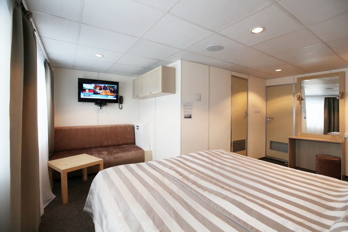 Двухместная однокомнатная каюта о всеми удобствами, расположенная на шлюпочной палубе. В каюте: два больших открывающихся обзорных окна, двуспальная кровать (можно раздвинуть), диван, кондиционер, телевизор, сейф, внутренний телефон, душ, санузел, фен, туалетные принадлежности, полотенца. Есть возможность размещения ребенка до 14 лет на дополнительном месте. Площадь каюты 18 кв.м. Каюты №: 404-415.