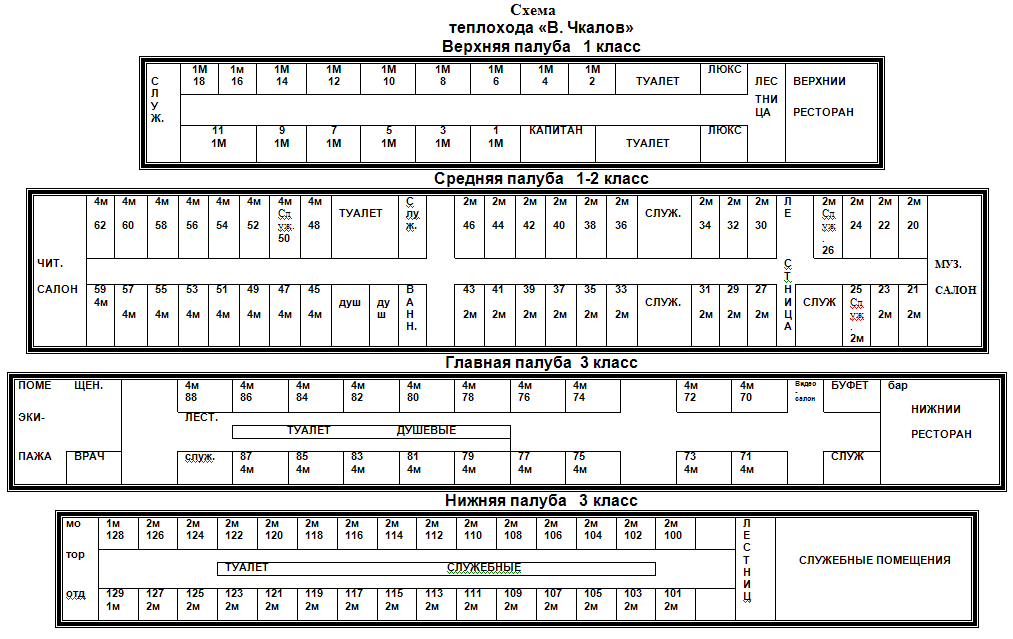 "В.Чкалов" - трехпалубный теплоход проекта 588 (класс Речного Регистра – «О»), построенный в Германии в 1953 году. Пассажировместимость - 260 человек. Каюты теплохода делятся на 3 класса и каюты категории Люкс. Каюты класса Люкс расположены на шлюпочной палубе. Каюты 1 и 2 класса расположены на шлюпочной и средней палубах. Оборудованы мягкими спальными местами и умывальниками с горячей и холодной водой. Каюты 3 класса расположены на главной и нижней палубах.