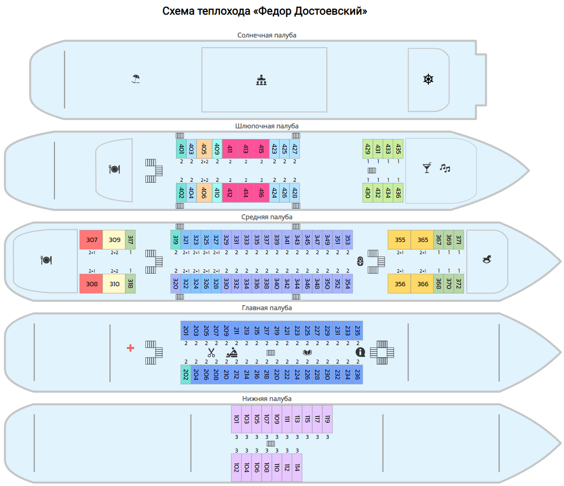 - 6 одноместных кают (№ 429-436). Расположение - на средней палубе.