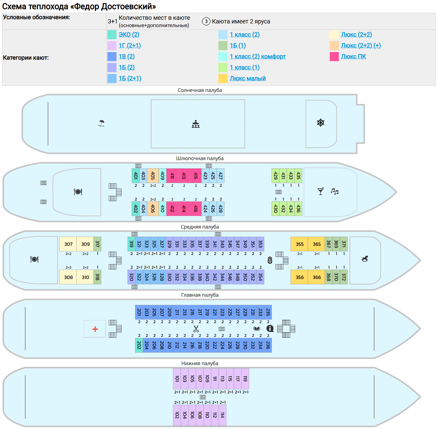 - 36 двухместных одноярусных кают (№201 – 236.). Расположение - на главной палубе.