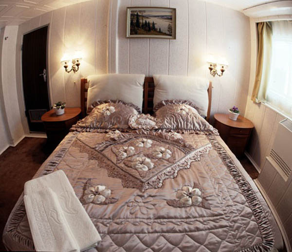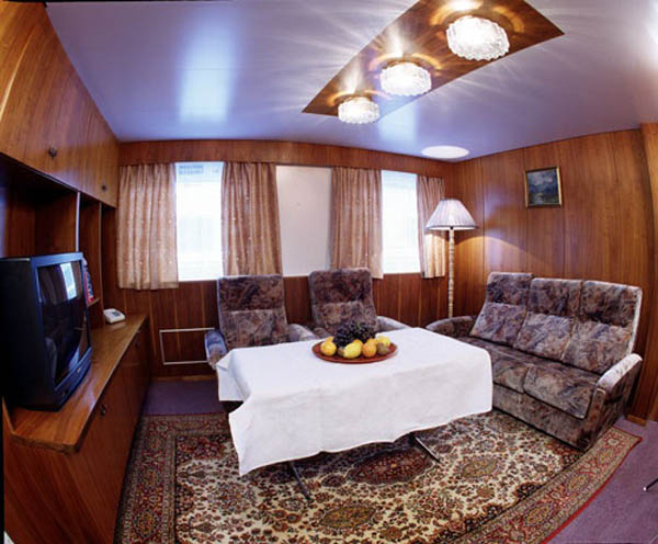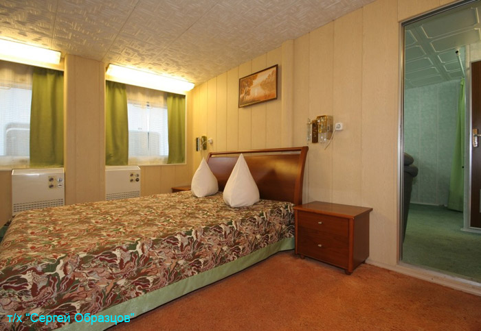Двухкомнатная двухместная каюта со всеми удобствами, расположенная на средней палубе. В каюте: двуспальная кровать, диван, телевизор, холодильник, душ, туалет, раковина, кондиционер, розетка 220V, радио, шкаф для одежды. Возможно размещение третьего человека на дополнительном месте – односпальный диван. Каюты № 355, 356, 365, 366.