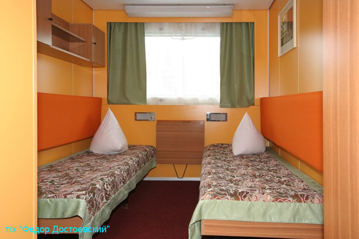 Двухместная каюта со всеми удобствами, расположенная на средней палубе. В каюте: два спальных места, душ, туалет, раковина, кондиционер, холодильник, розетка 220V, радио, шкаф для одежды. Каюты №: 320, 329-354.