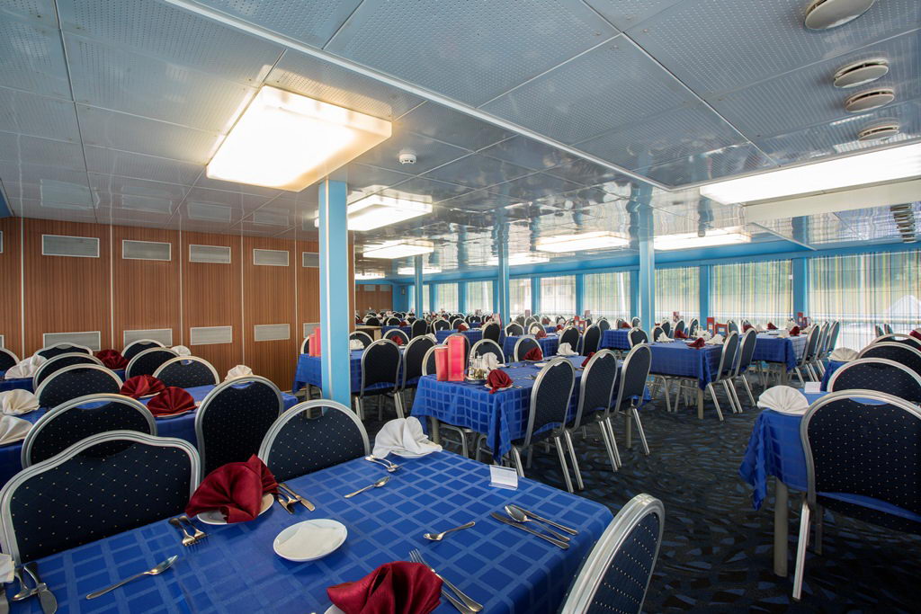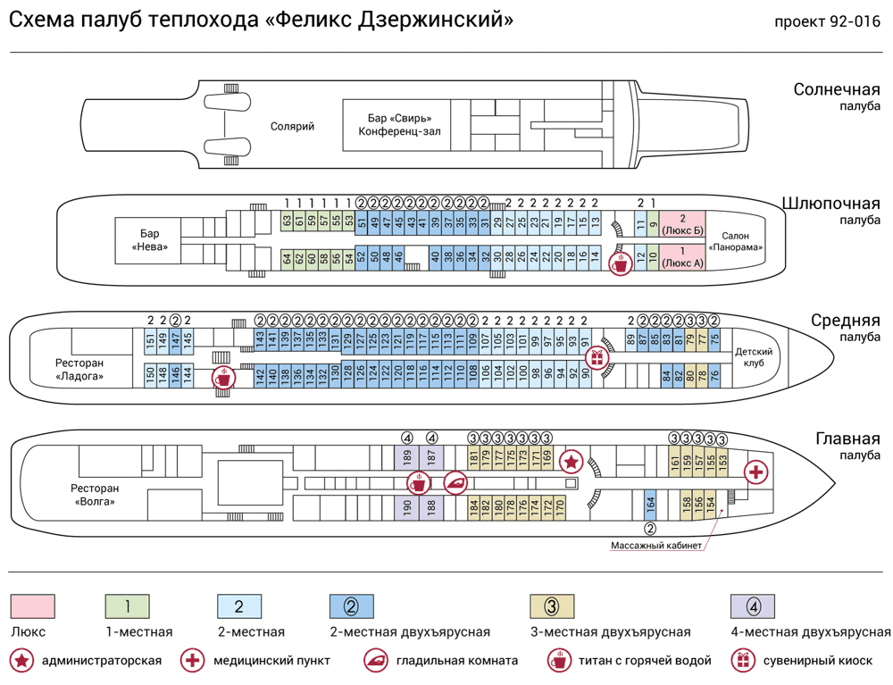 Во всех каютах: шкаф для одежды, радио, кондиционер, душ, санузел, обзорное окно, электророзетка 220V.