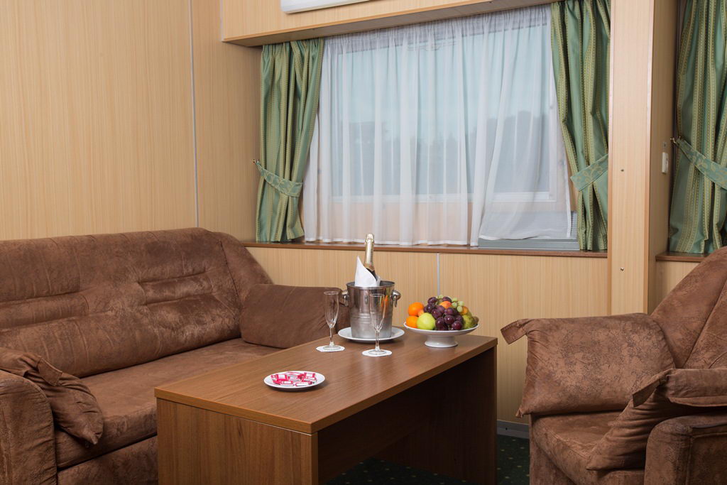 Двухкомнатная каюта с удобствами (душ, санузел, кондиционер), на шлюпочной палубе, рассчитана на размещение от двух до четырех человек. В гостиной - мягкая мебель (кресло, диван — раскладывающийся на двух человек), телевизор с DVD, холодильник, радио, два обзорных окна, электророзетка на 220V. В спальне: двуспальная кровать, шкаф для одежды, два обзорных окна, фен. Каюты: Люкс А, Люкс Б.