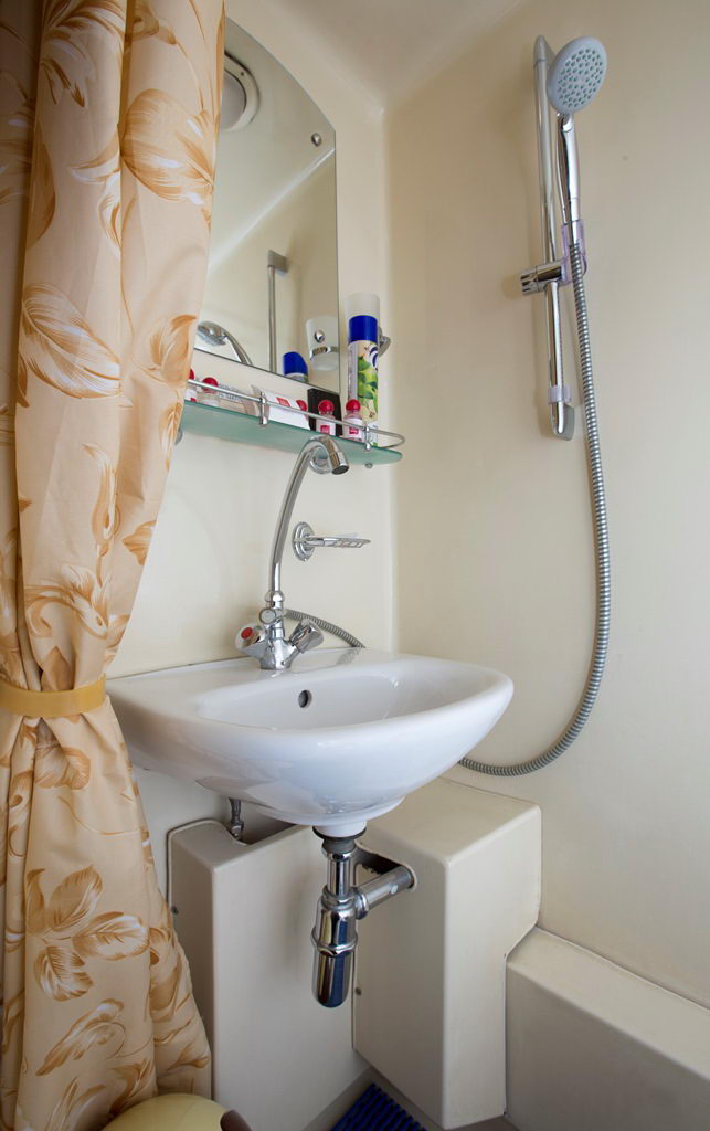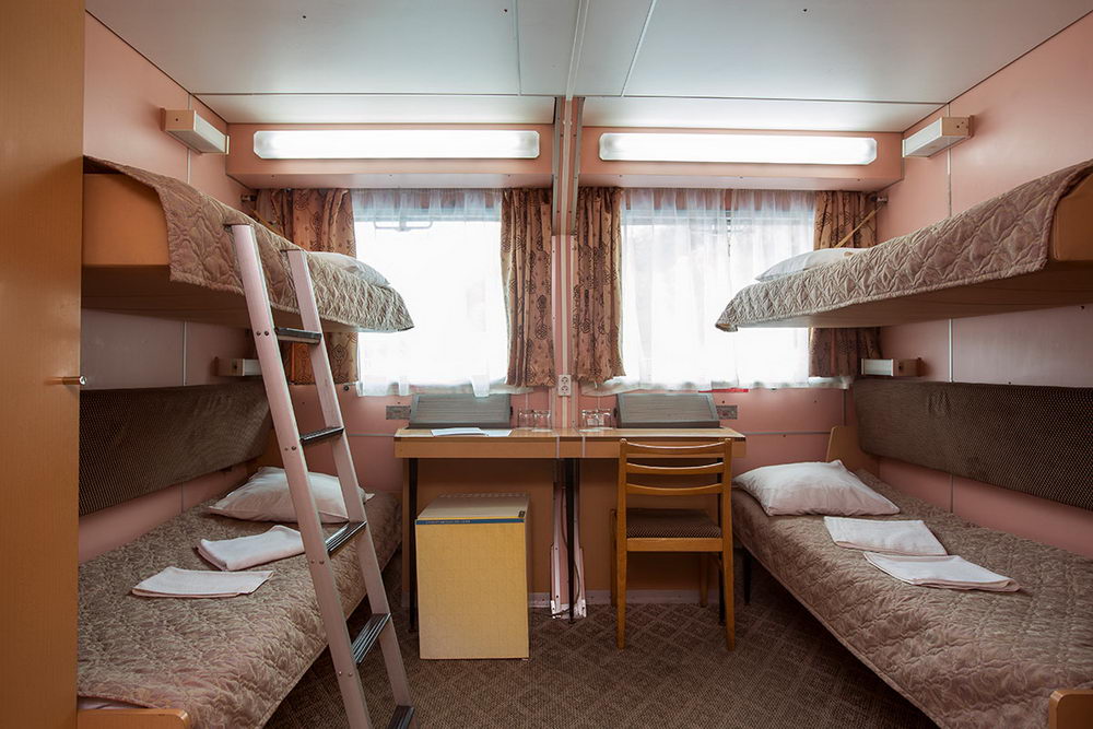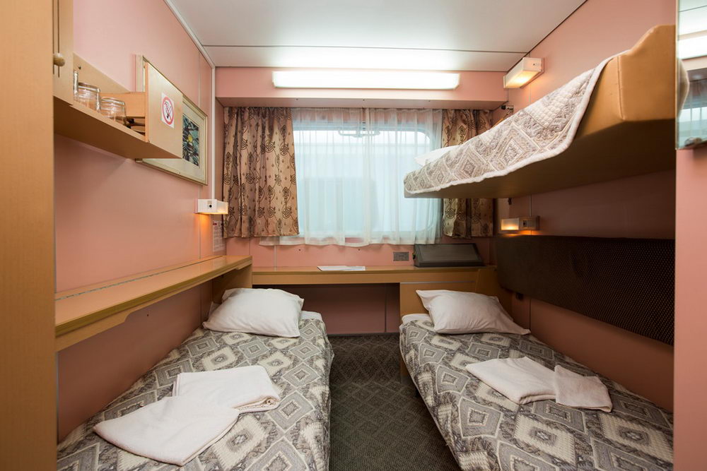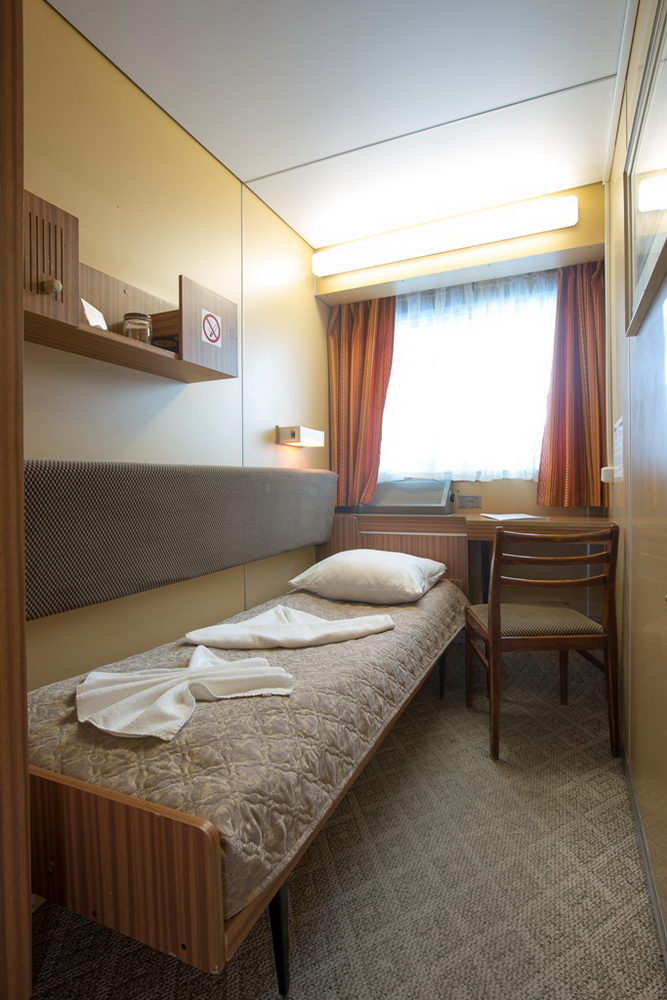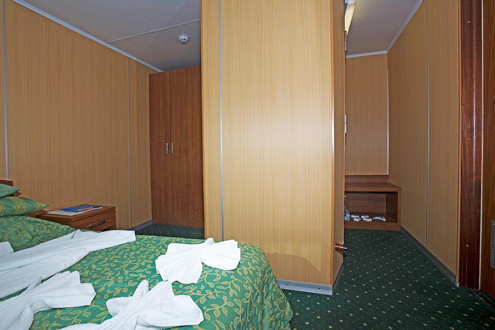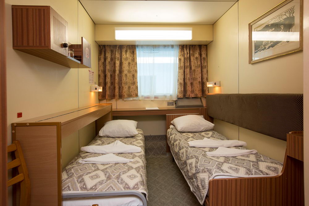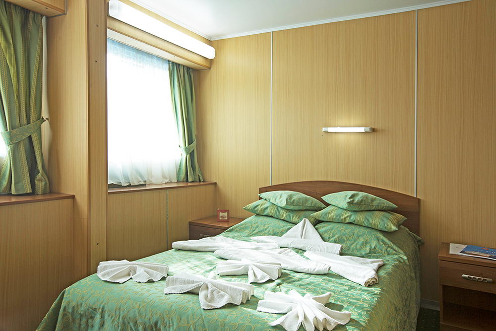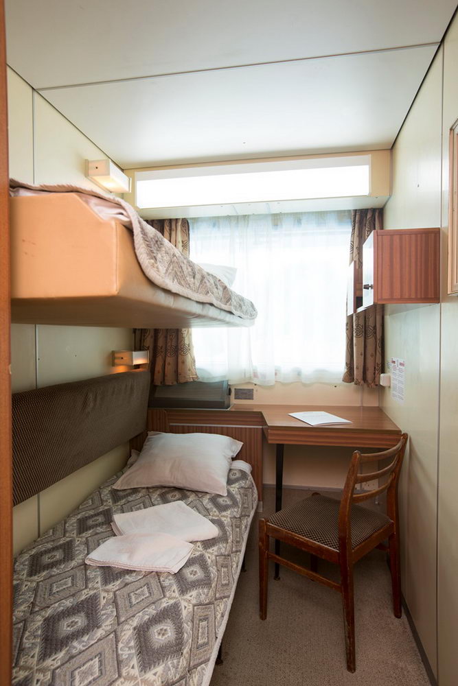 Двухместная двухъярусная каюта на главной палубе. В каюте: два спальных места (одно над другим), шкаф для одежды, радио, душ, санузел, кондиционер, обзорное окно, электророзетка на 220V. Каюты №: 164.