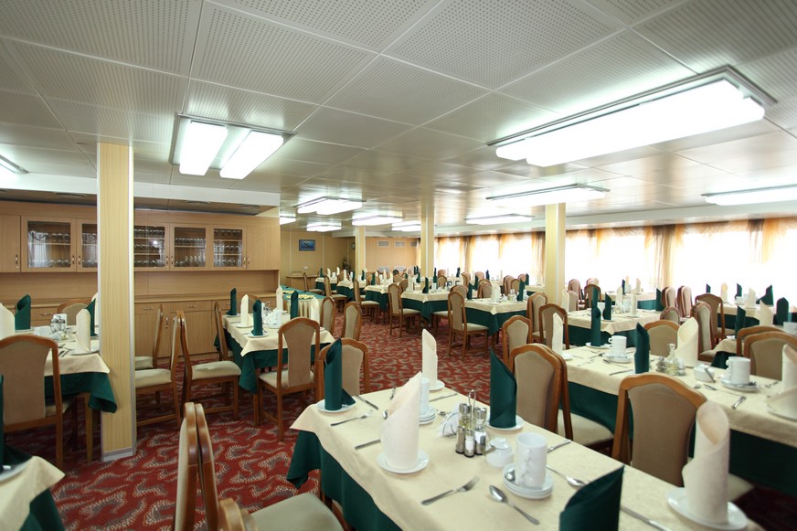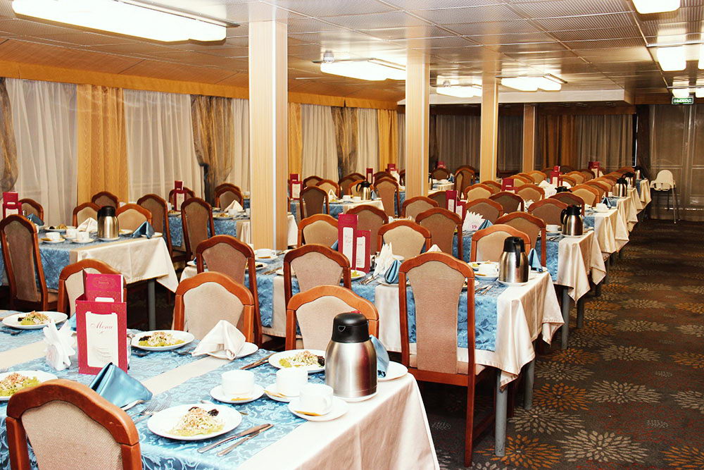 • обед и ужин — заказная система со второго дня круиза (при отправлении в рейс в 21:00 или позднее ужин — «шведский стол» (свободная рассадка);
