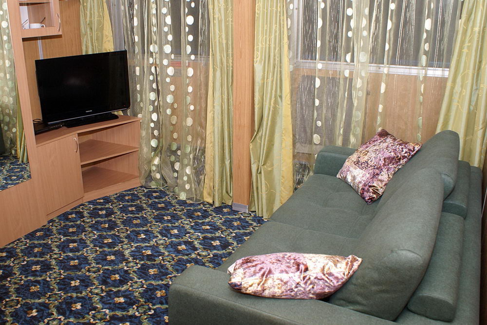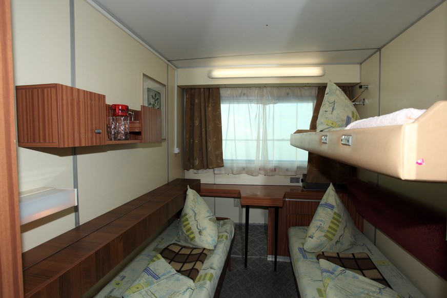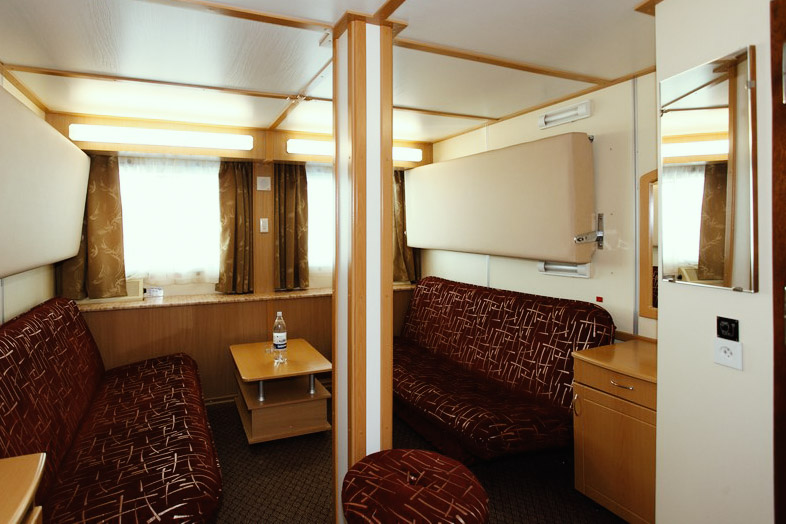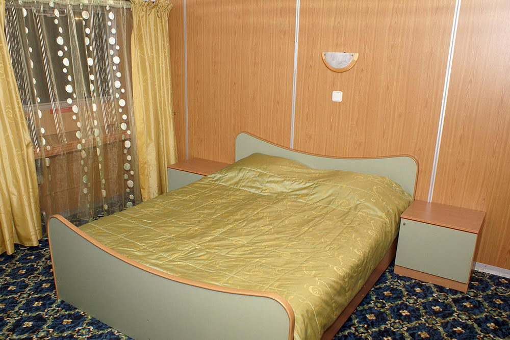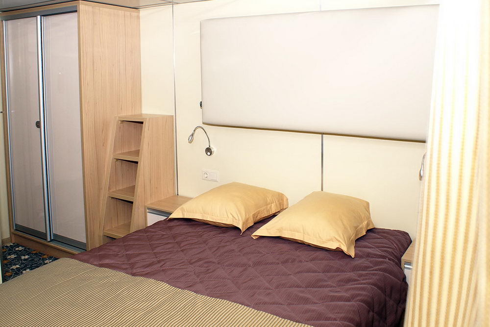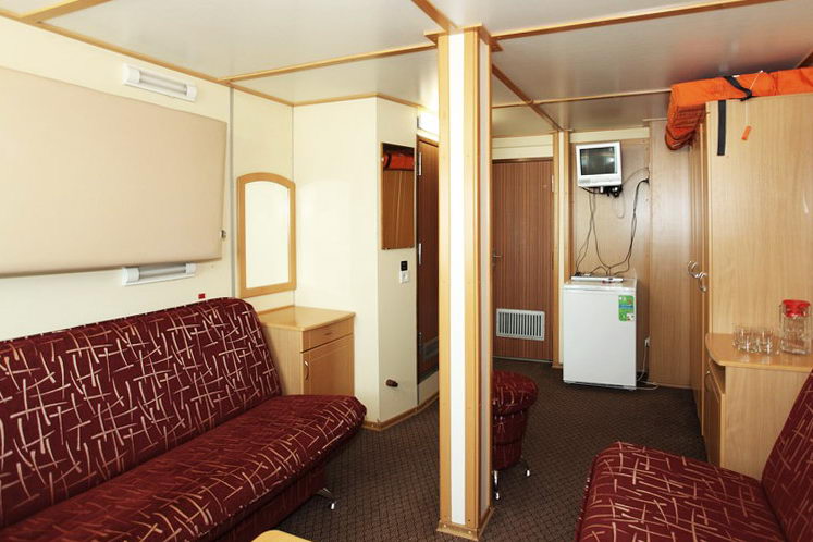 Однокомнатная каюта с удобствами (душ, санузел, кондиционер), на средней палубе. Каюта рассчитана на размещение от двух до трех человек. В каюте: двуспальная кровать, дополнительное третье место вторым ярусом, шкаф для одежды, зеркало, телевизор с DVD, холодильник, радио, два обзорных окна, электророзетка на 220V.В каюте: двуспальная кровать, одно спальное место вторым ярусом, два шкафа для одежды, зеркало, телевизор с DVD, холодильник, радио, два обзорных окна, электророзетка на 220V. Площадь каюты - 12,88 кв.м. Каюты №: 136, 141.
