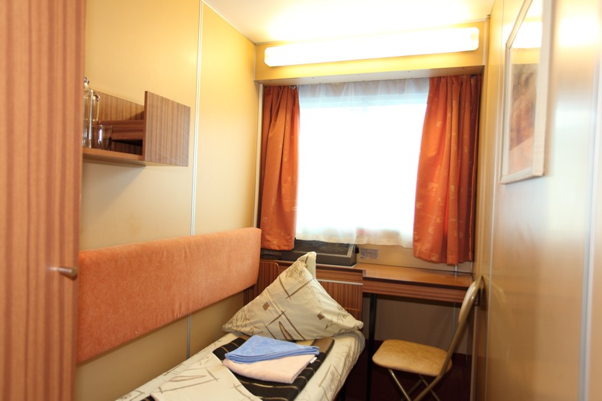 Одноместная каюта с удобствами, на главной палубе. В каюте: одно спальное место, шкаф для одежды, зеркало, радио, душ, санузел, кондиционер, обзорное окно, электророзетка на 220V. Площадь кают от 5,8 до 6,2 кв.м. Каюты №: 184, 194-196.