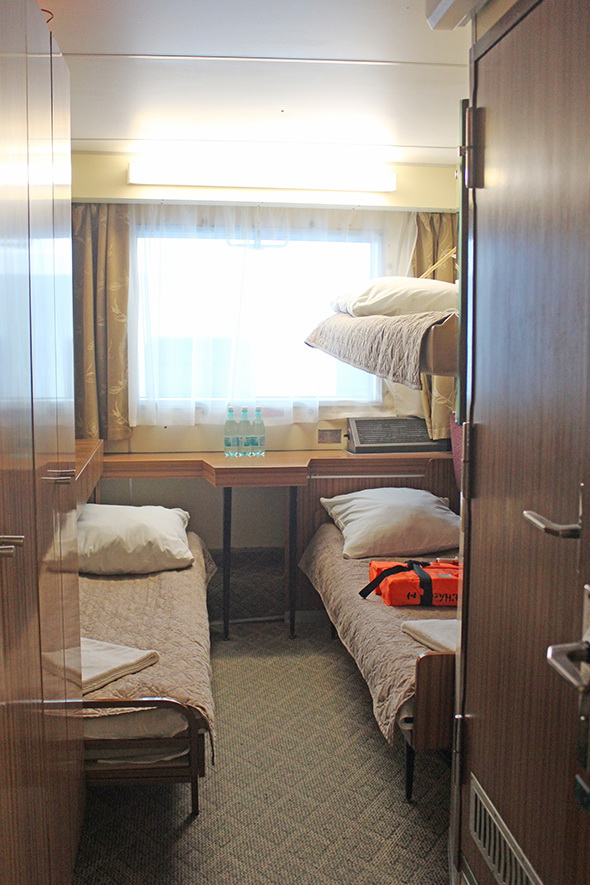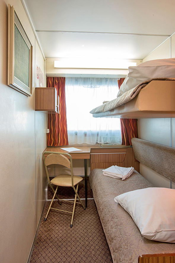 Двухместная двухъярусная каюта с удобствами, на главной палубе. В каюте: два спальных места (одно над другим), шкаф для одежды, зеркало, радио, душ, санузел, кондиционер, обзорное окно, электророзетка на 220V. Площадь кают от 5,8 до 7,7 кв.м. Каюты №: 163, 183, 185, 187-192.