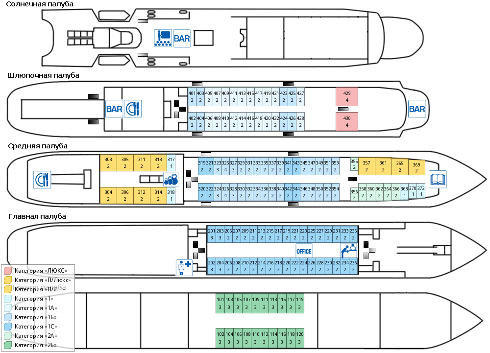 Двухместная двухъярусная каюта, расположенная на средней палубе. В каюте имеется индивидуальный санблок (умывальник, туалет, душ), кондиционер, холодильник, телевизор, внутрисудовая телефонная связь. Каюты №: 355, 356, 358, 360, 362, 364, 366.