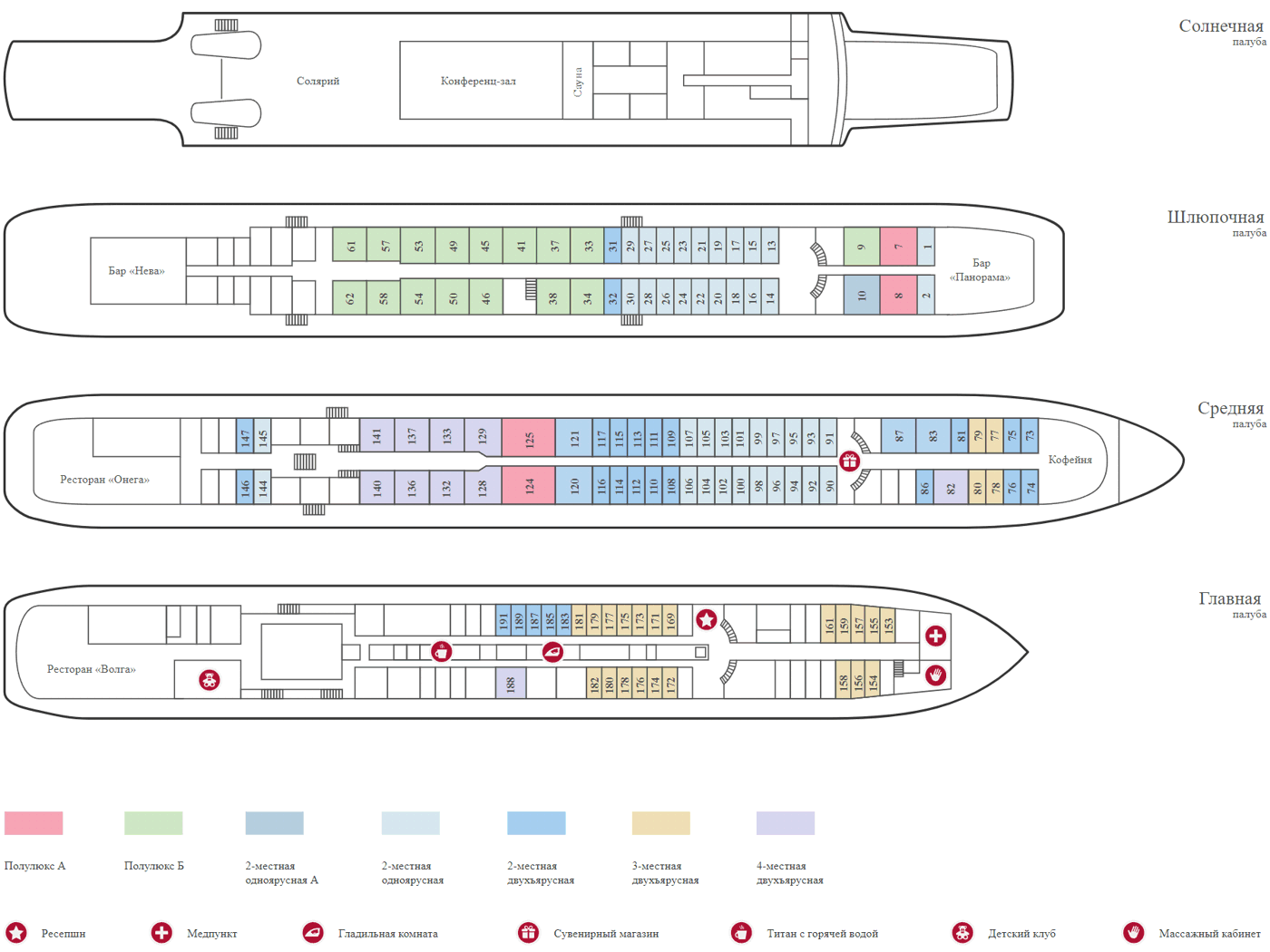 Во всех каютах: шкаф для одежды, радио, кондиционер, фен, холодильник (кроме кают 77, 78, 79, 80, 172, 174, 175, 177, 178), душ, санузел, обзорное окно, электророзетка 220V.
