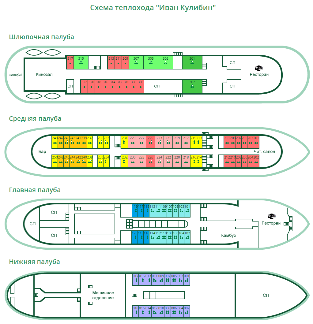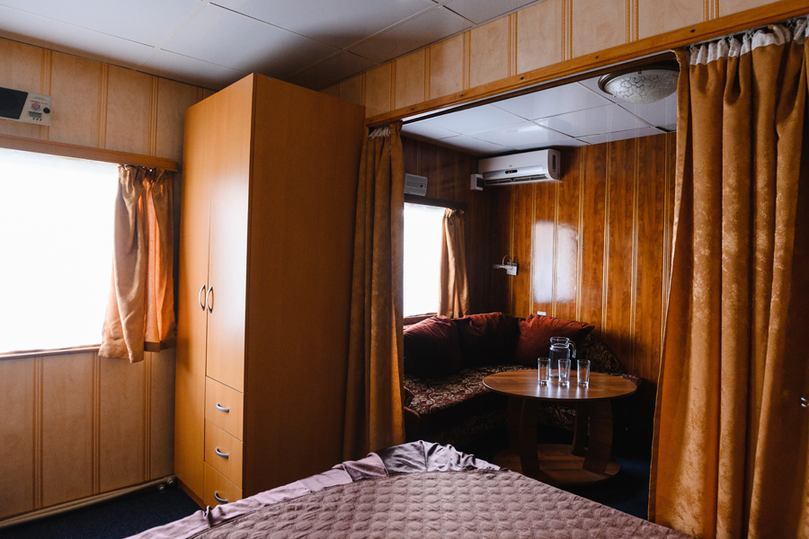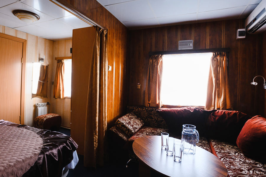 К вашим услугам: 2-х местные каюты без удобств, 3-х и 4-х местные каюты с умывальником (горячая и холодная вода), 1, 2-х, 3-х местные каюты с удобствами (душ, санузел, холодильник, кондиционер), каюты класса "Полулюкс" (душ, санузел, холодильник, кондиционер) и "Люкс" (все удобства, видеодвойка, кондиционер, раскладывающийся диван).