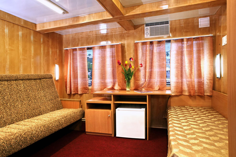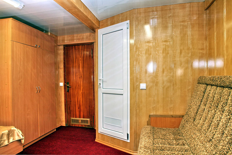 Двухместная двухкомнатная каюта с удобствами, на шлюпочной палубе. В каюте: душевая кабина, санузел, TV видео-двойка, абсорбционный мини-холодильник, кондиционер, угловой диван, шкаф для одежды, радио. Каюты №: 301, 302.