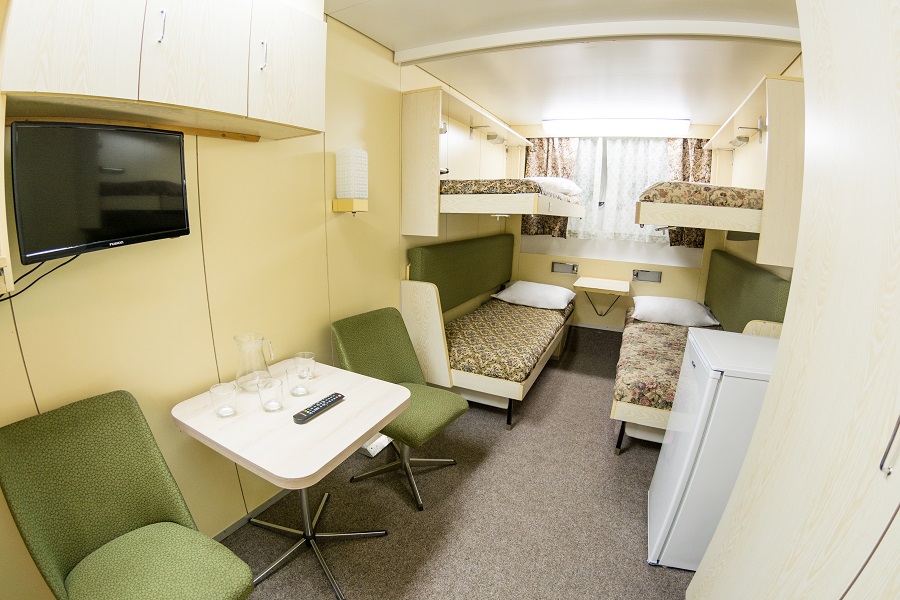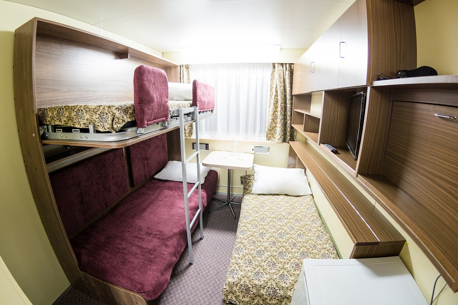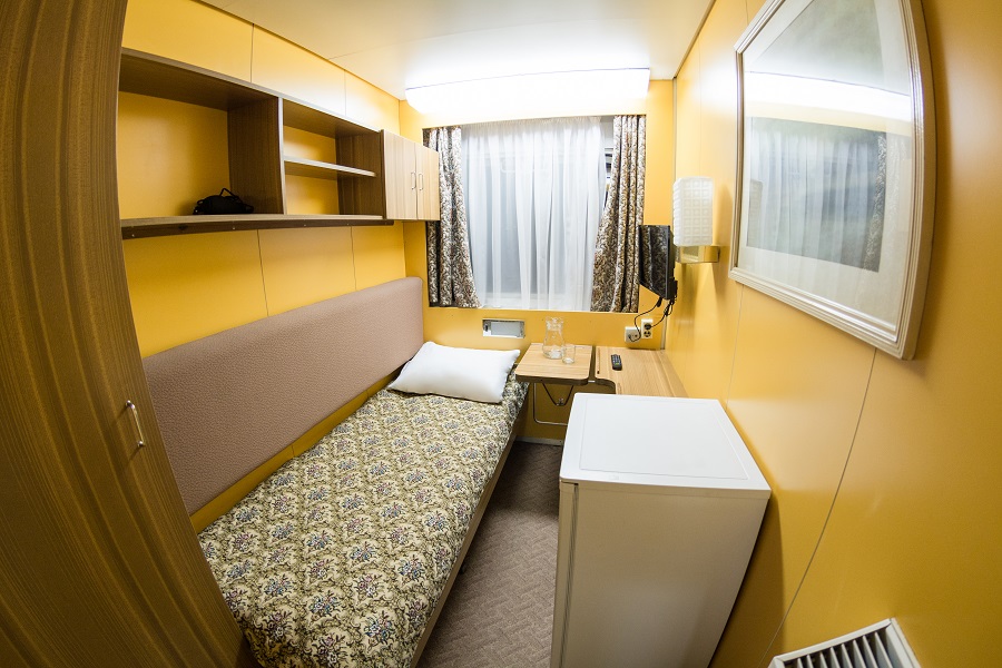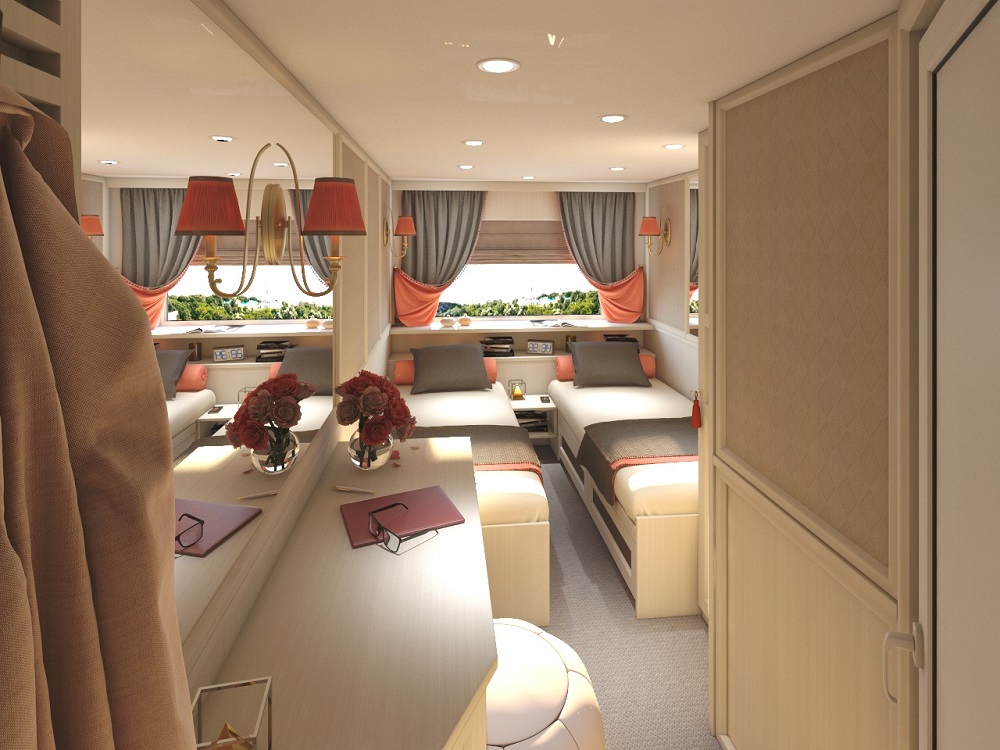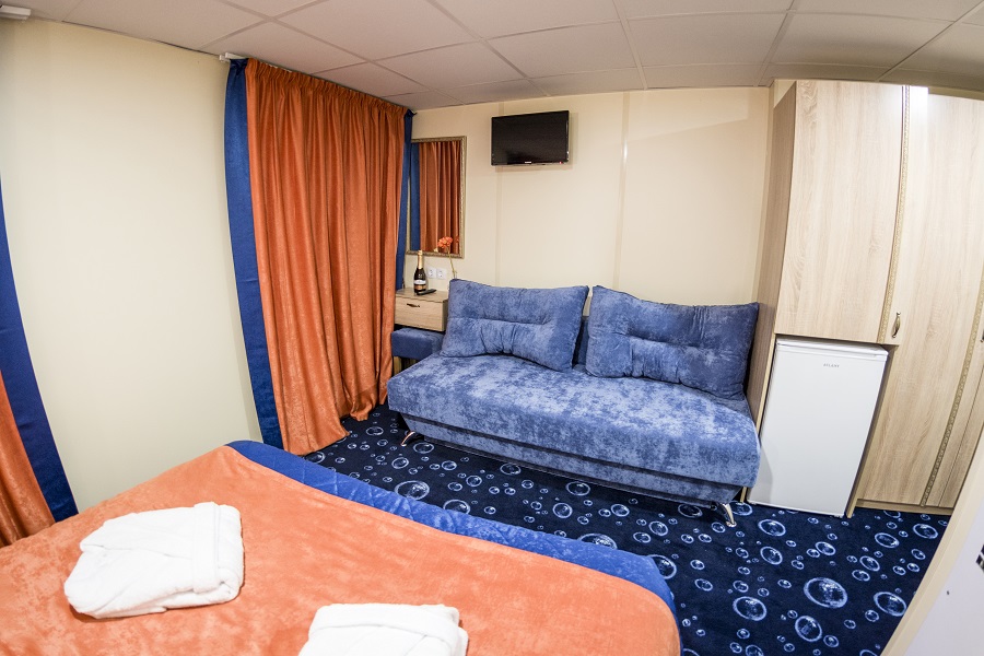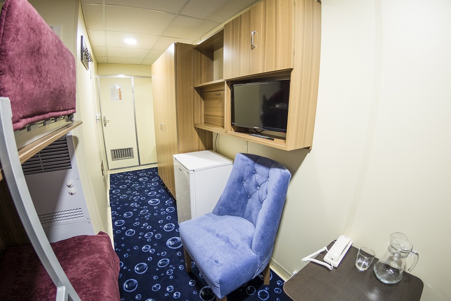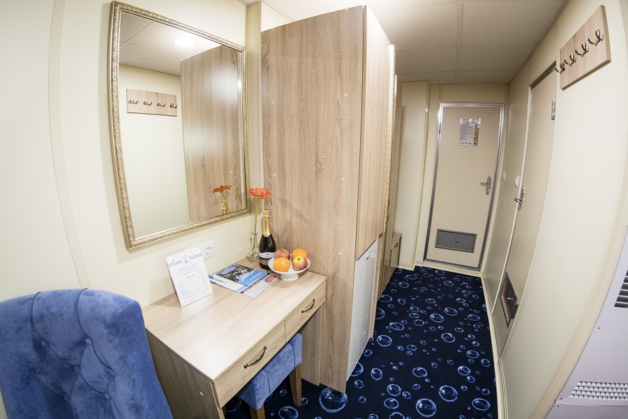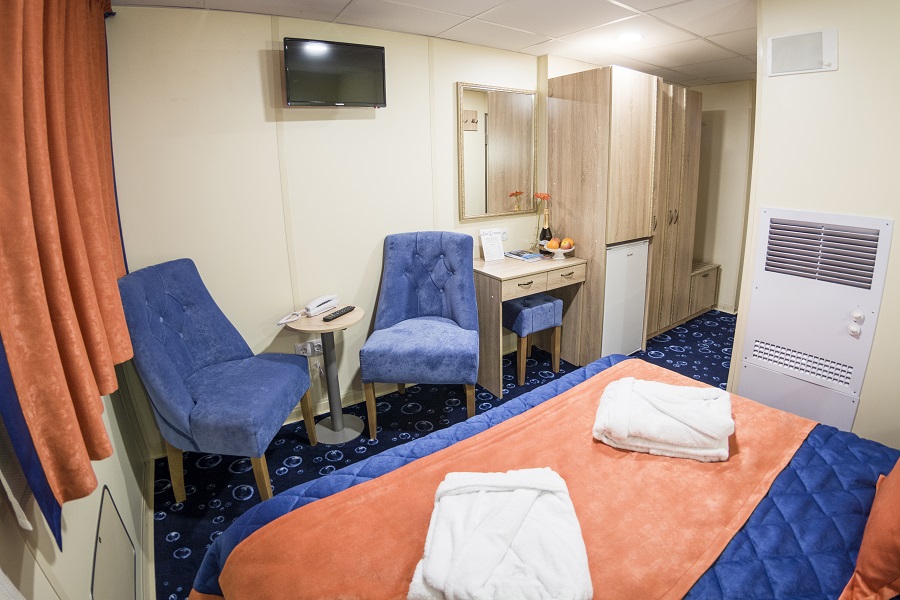 В каюте: одна двуспальная кровать (при необходимости трансформируется в две односпальные кровати), кресло-кровать, ванная комната (раковина, душевая кабина, туалет), прикроватные тумбы, туалетный стол, настенная полка, пуф, вешалка для верхней одежды, шкаф, холодильник, кондиционер, радио, фен, плед для каждого туриста, сейф, телевизор с кабельным и спутниковым вещанием, телефон, розетки 220V, одно панорамное окно.