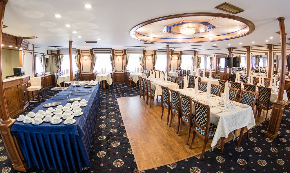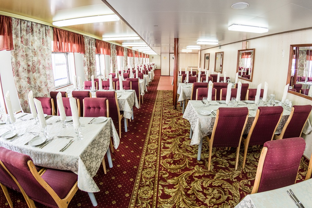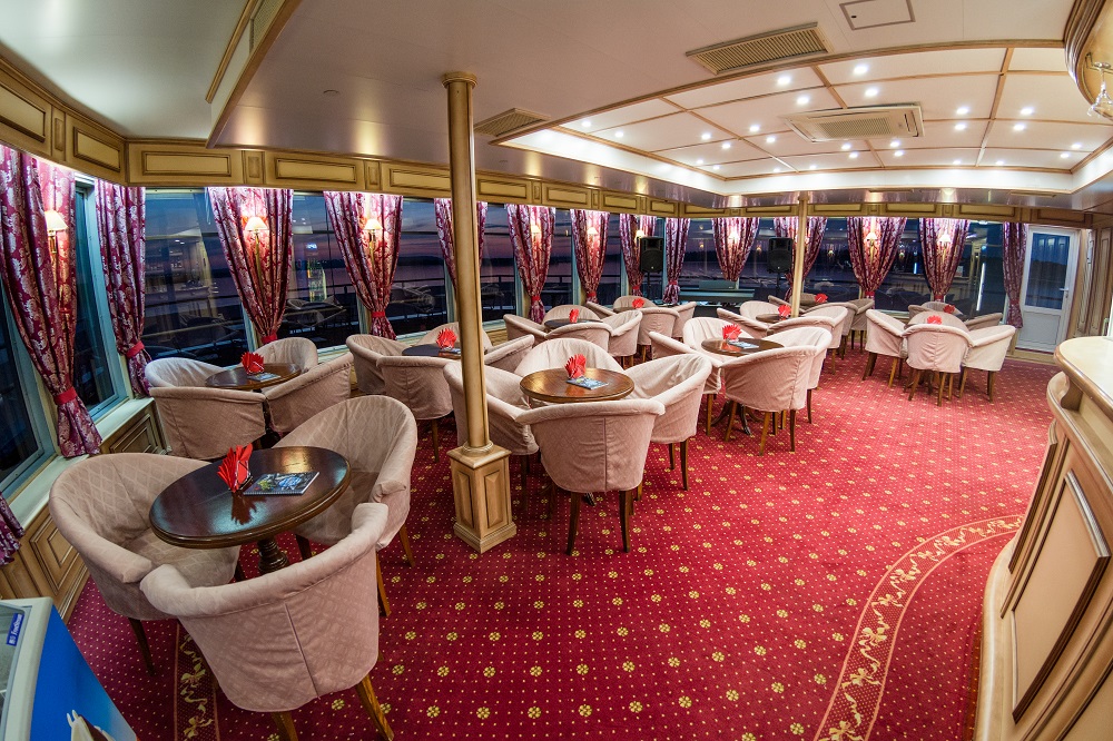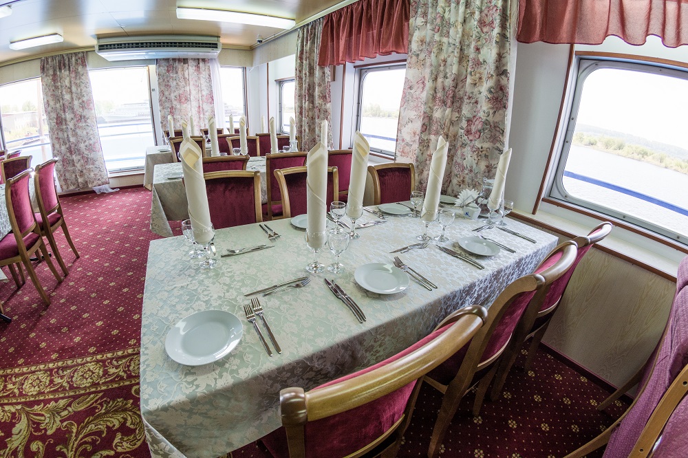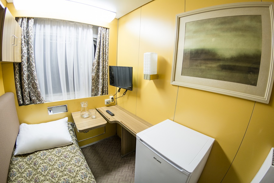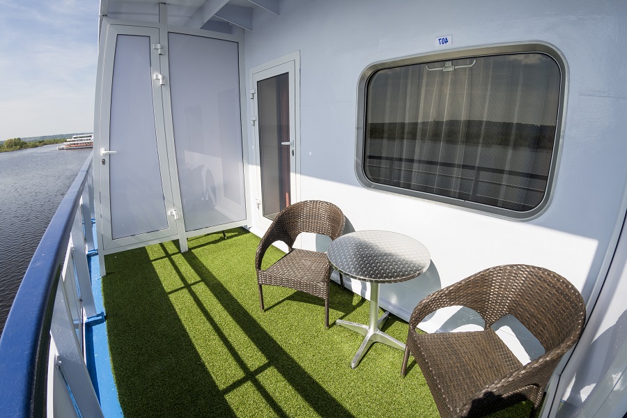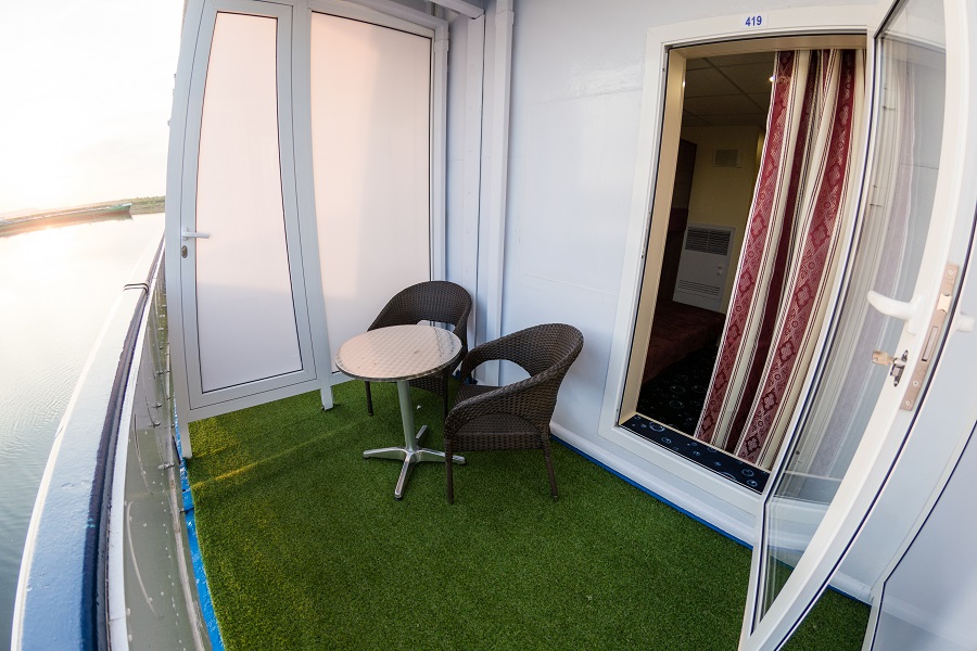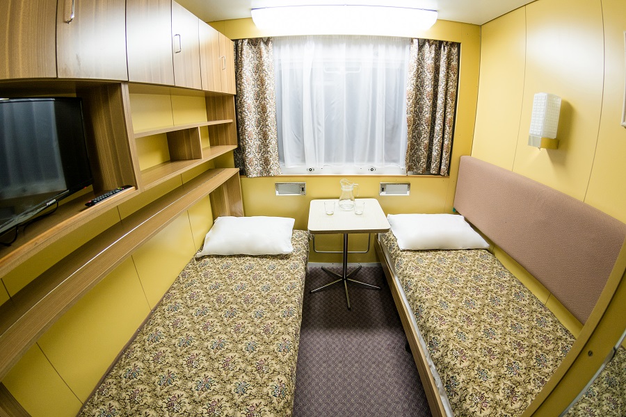 В каюте: одна двуспальная кровать (при необходимости трансформируется в две односпальные кровати), кресло-кровать, ванная комната (раковина, душевая кабина, туалет), прикроватные тумбы, туалетный стол, настенная полка, пуф, вешалка для верхней одежды, шкаф, холодильник, кондиционер, радио, фен, плед для каждого туриста, сейф, телевизор с кабельным и спутниковым вещанием, телефон, розетки 220V, одно панорамное окно.