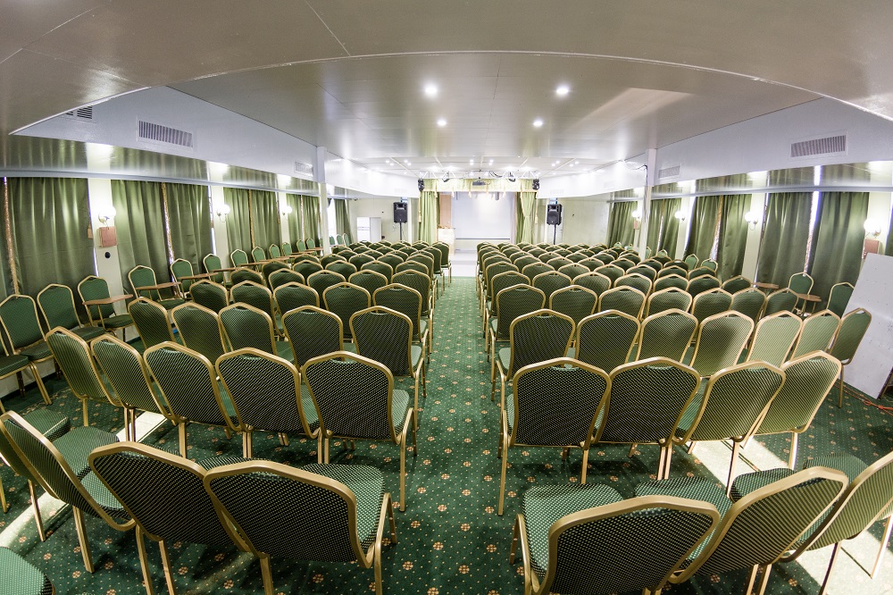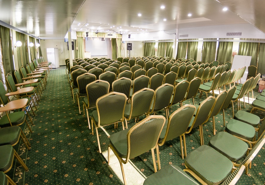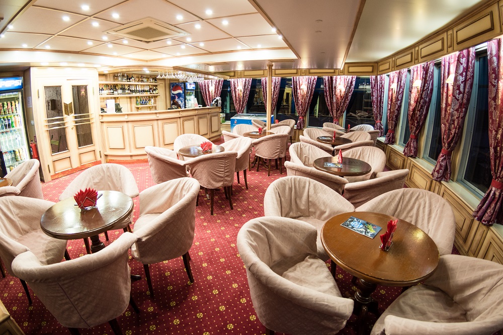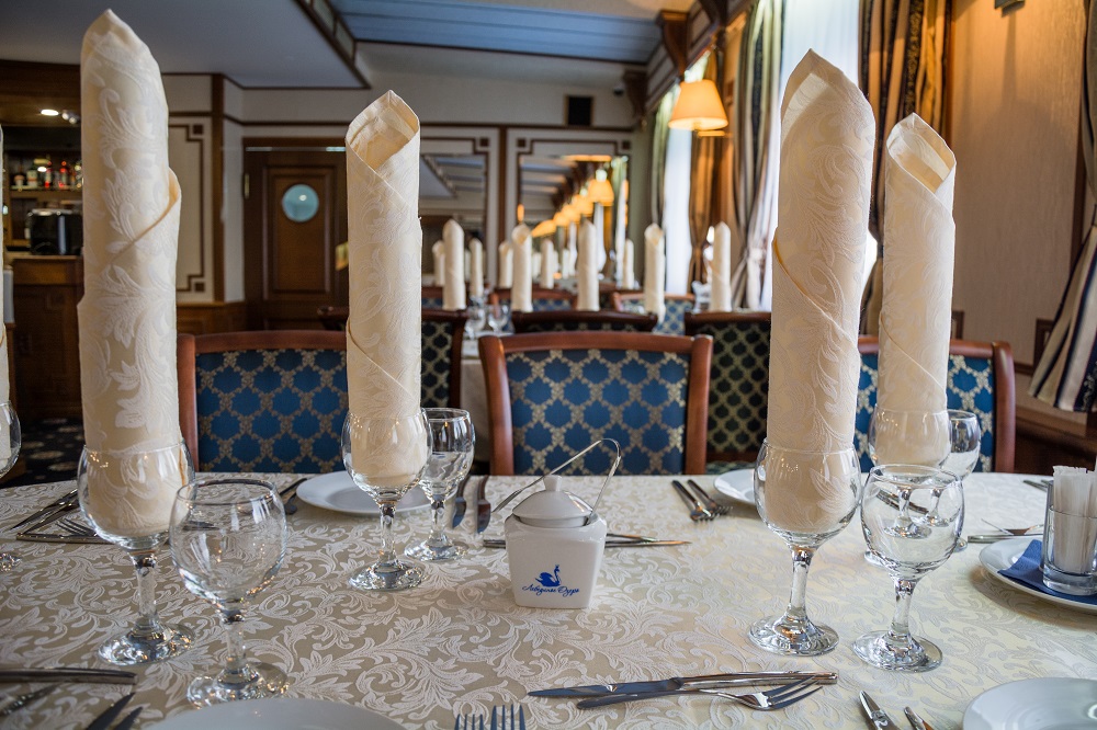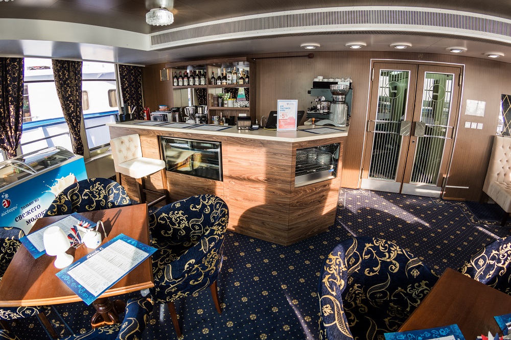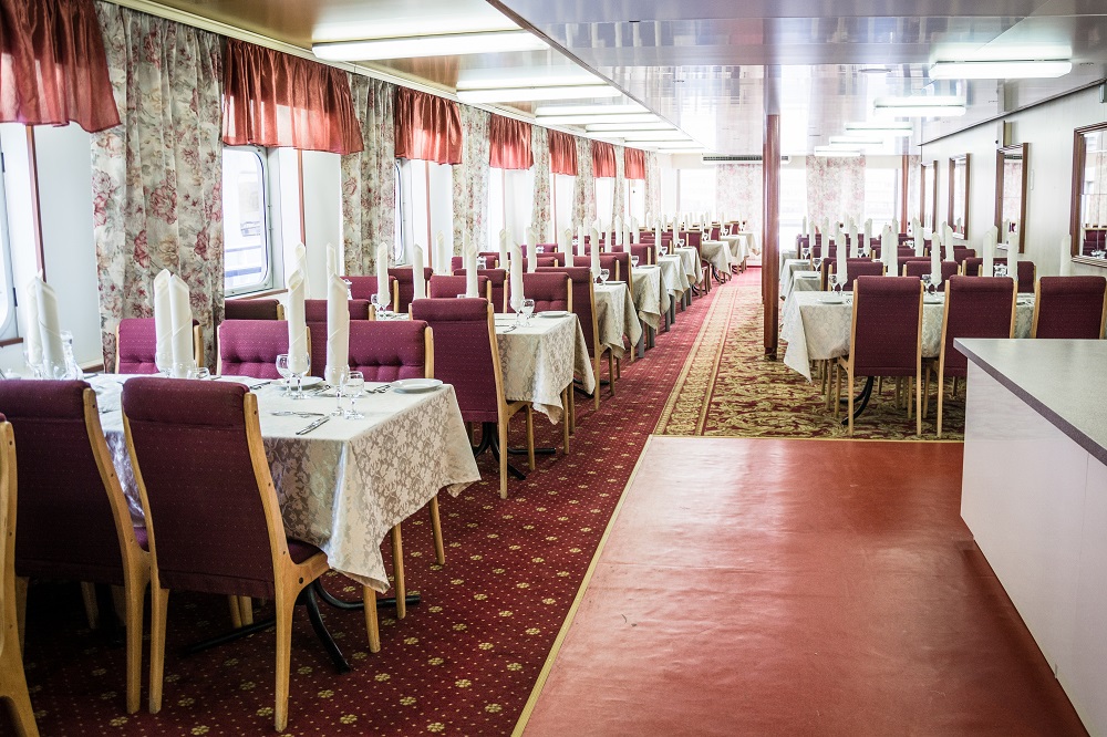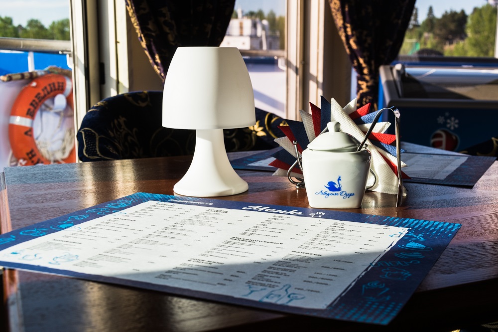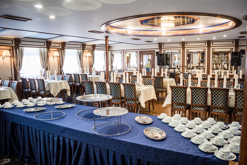 В каюте: одна двуспальная кровать (при необходимости трансформируется в две односпальные кровати), кресло-кровать, ванная комната (раковина, душевая кабина, туалет), прикроватные тумбы, туалетный стол, настенная полка, пуф, вешалка для верхней одежды, шкаф, холодильник, кондиционер, радио, фен, плед для каждого туриста, сейф, телевизор с кабельным и спутниковым вещанием, телефон, розетки 220V, одно панорамное окно.
