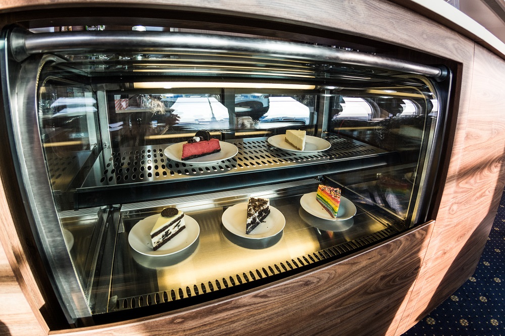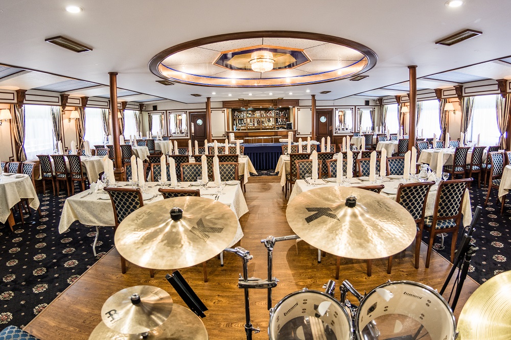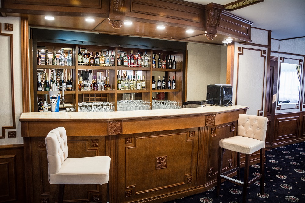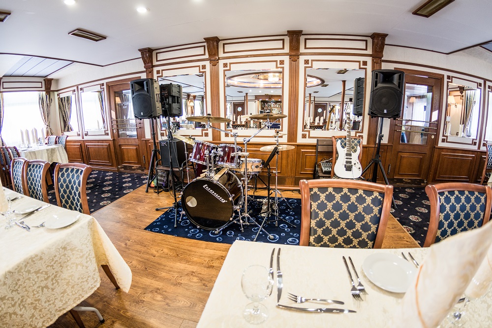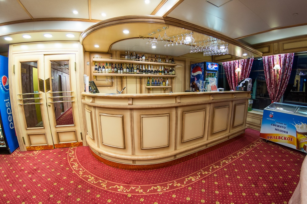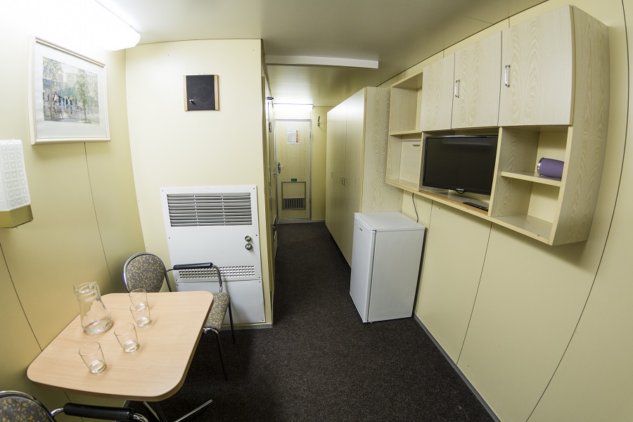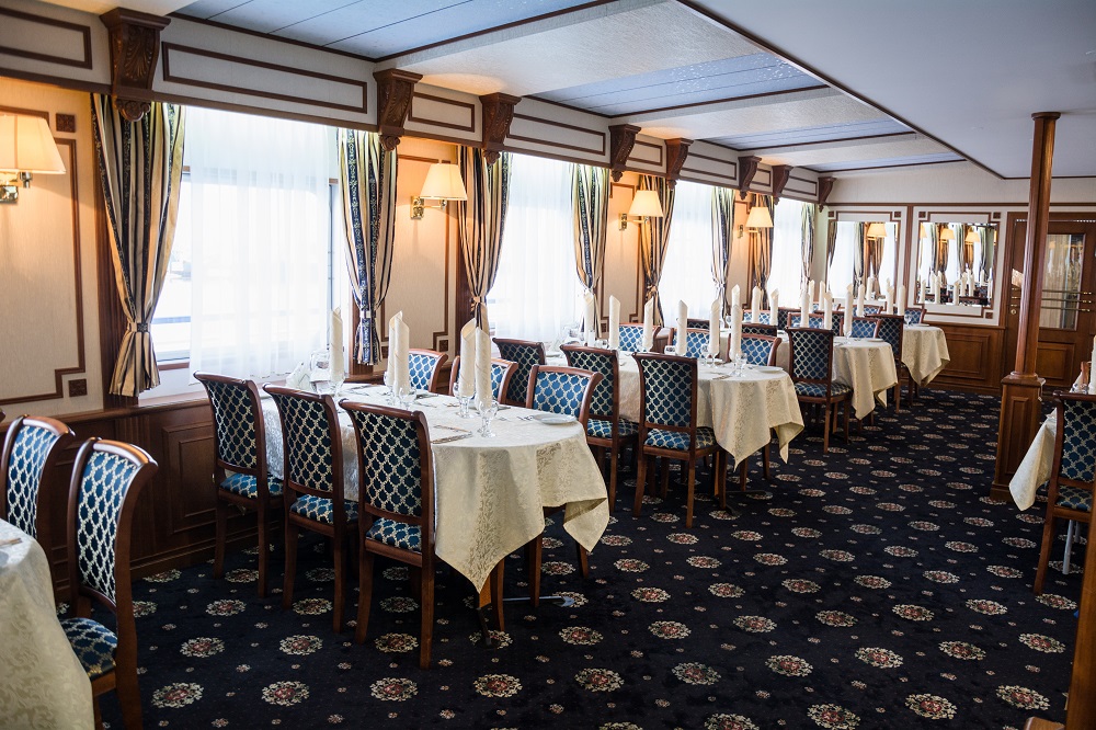 В каюте: одна двуспальная кровать (при необходимости трансформируется в две односпальные кровати), кресло-кровать, ванная комната (раковина, душевая кабина, туалет), прикроватные тумбы, туалетный стол, настенная полка, пуф, вешалка для верхней одежды, шкаф, холодильник, кондиционер, радио, фен, плед для каждого туриста, сейф, телевизор с кабельным и спутниковым вещанием, телефон, розетки 220V, одно панорамное окно.