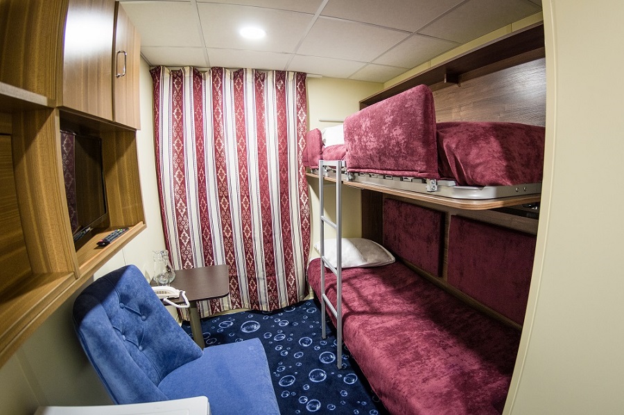 Возможно размещение третьего человека на дополнительном месте – кресло-кровать. Размер дополнительного места: 190 см длина и 75 см ширина. Размещение ребенка до 5 лет без места и питания, при наличии свободного дополнительного места, производится только по согласованию с судоходной компанией.