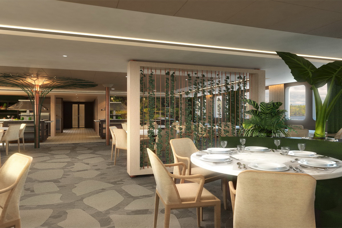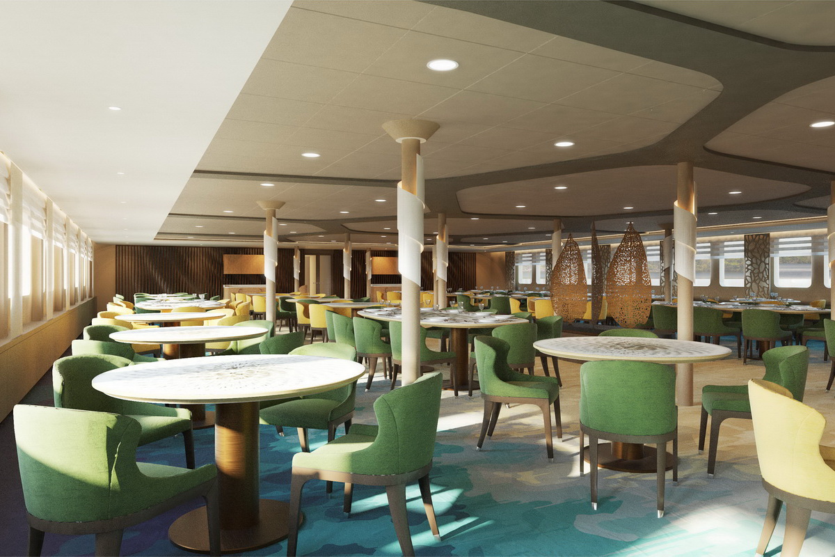 Великолепная дизайнерская сервировка, живая музыка, романтичные ужины при свечах и исключительное обслуживание удовлетворят даже самых взыскательных клиентов. Для гостей ресторана составлена премиальная барная карта, работает профессиональный сомелье. Доставка блюд и напитков в каюту — 24/7