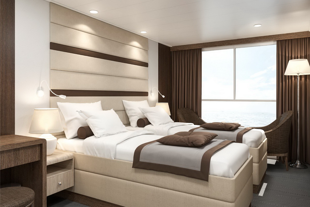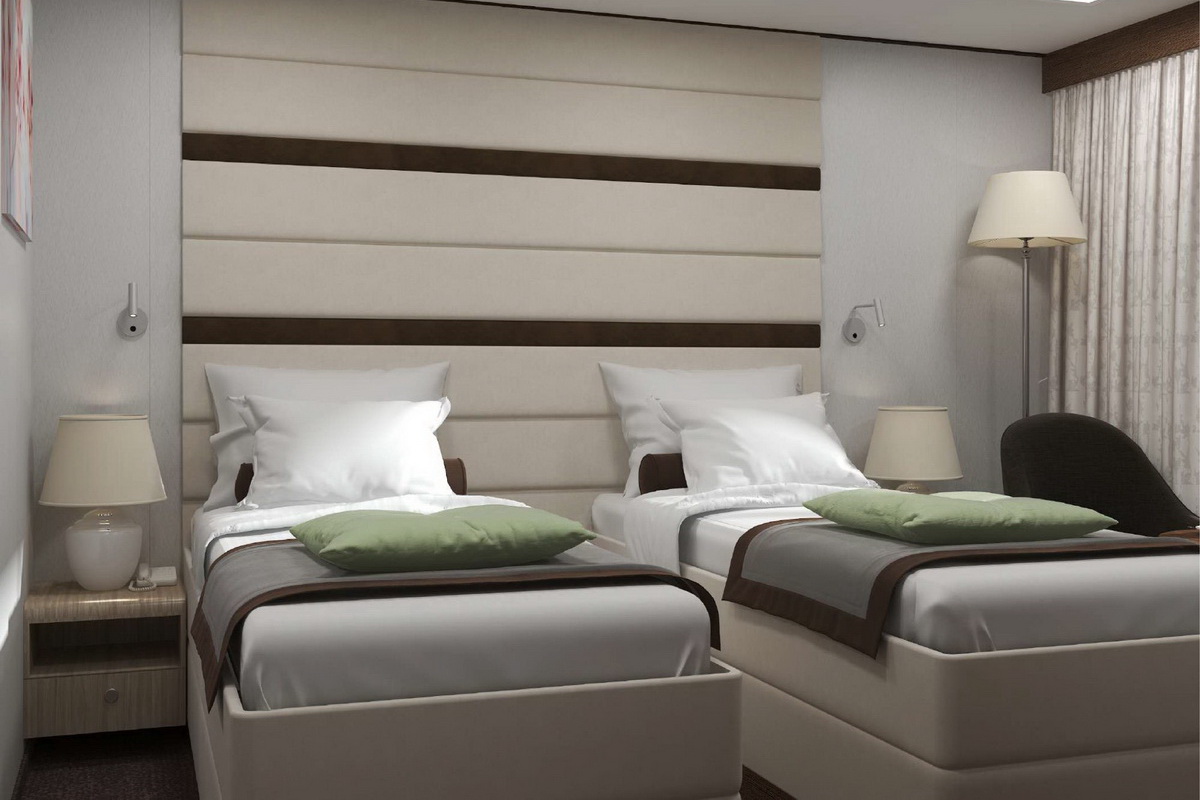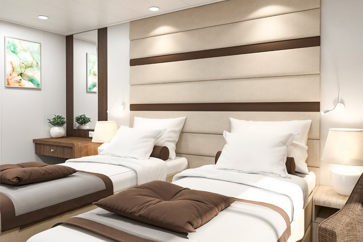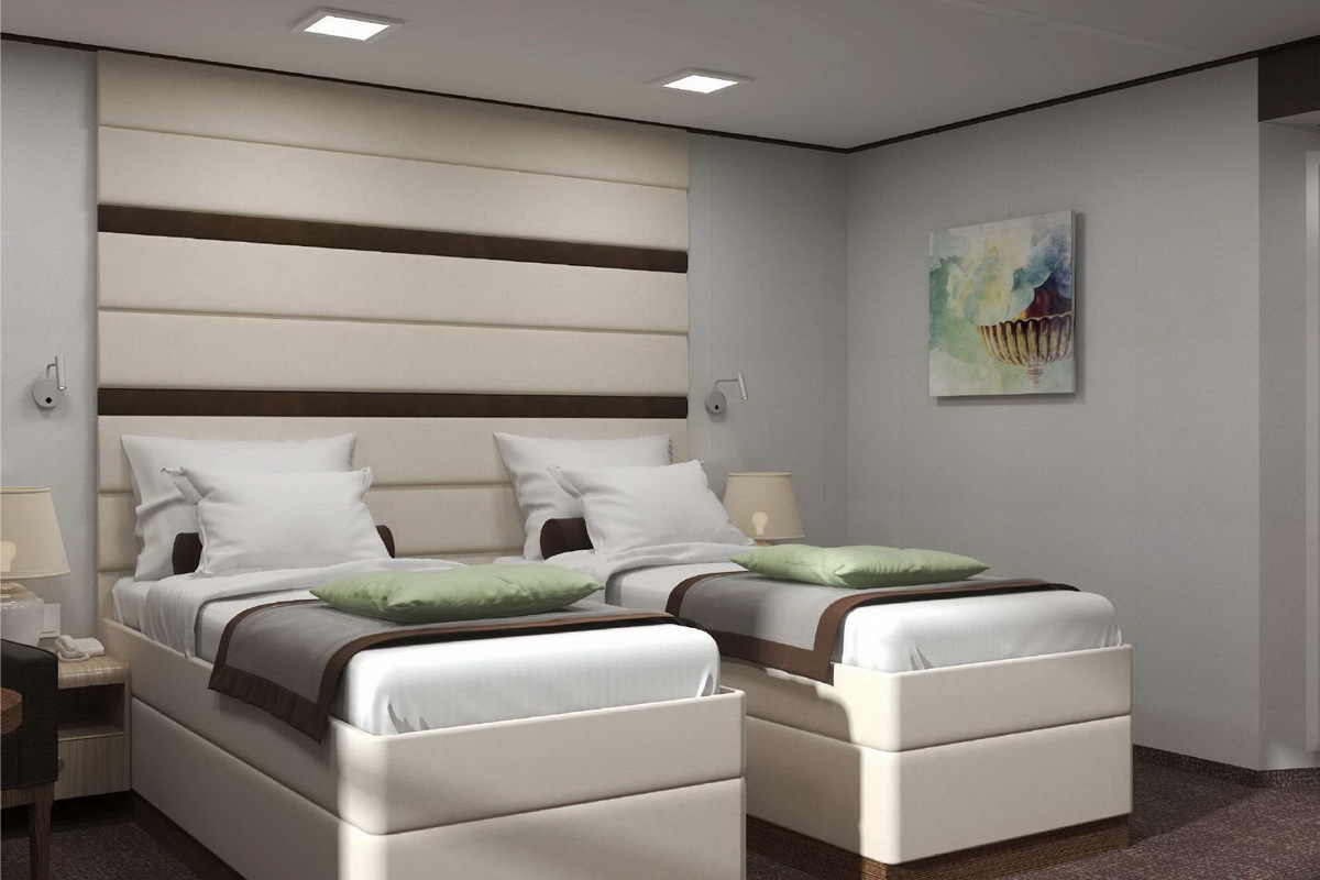Двухместные каюты Делюкс, расположенные на шлюпочной палубе. В каюте: две односпальные кровати (сдвигаются), панорамные окна, спутниковое ТВ, шкаф для одежды, холодильник, розетки 220V, телефон, радио, фен, кофемашина, электрочайник, сейф, душ, санузел.