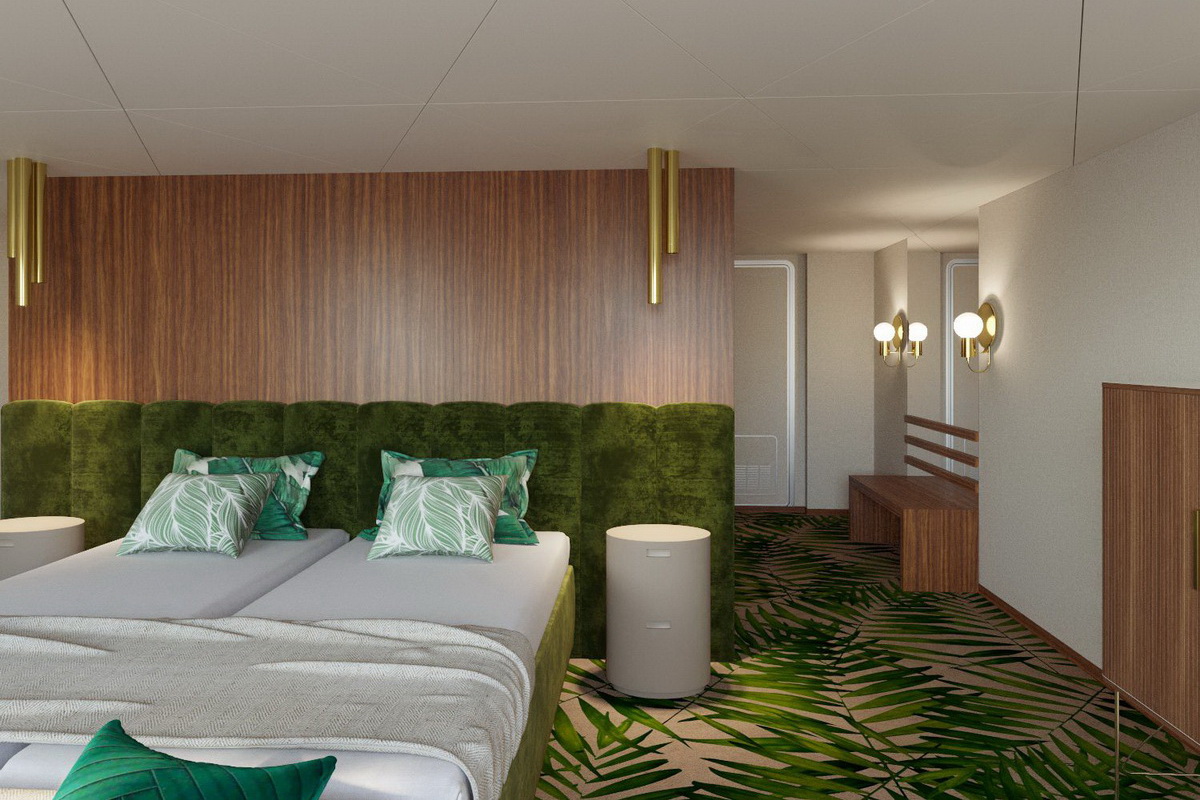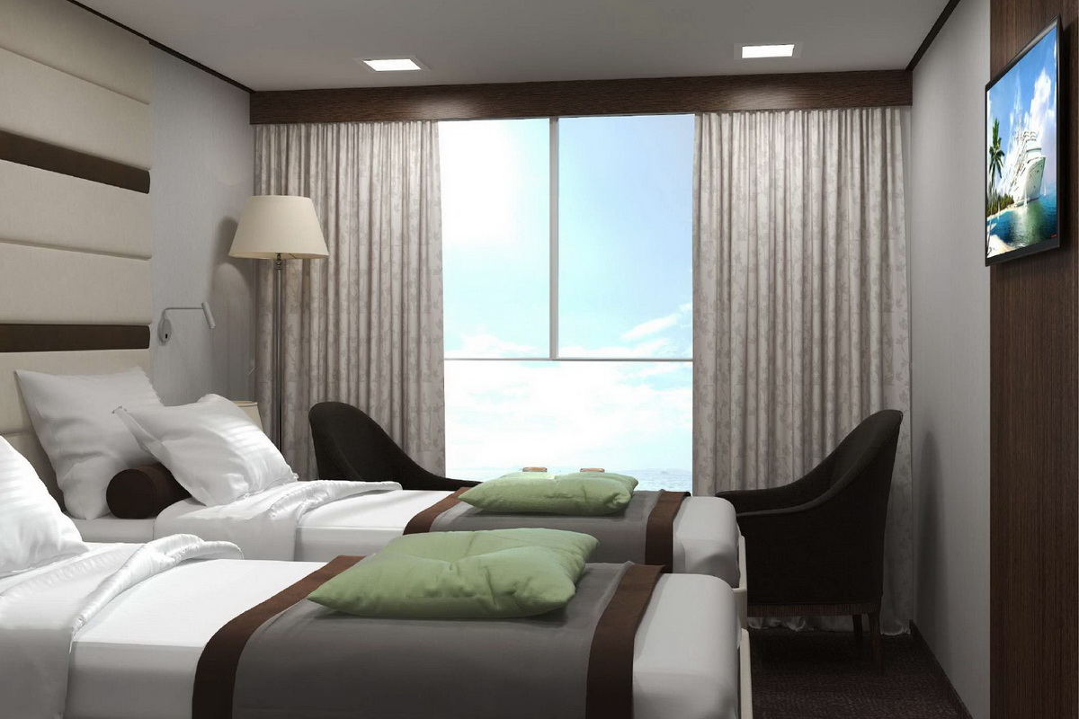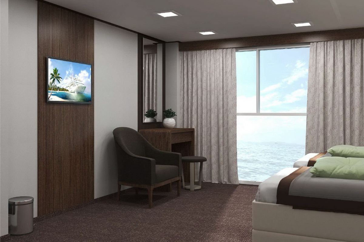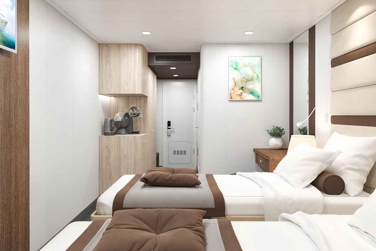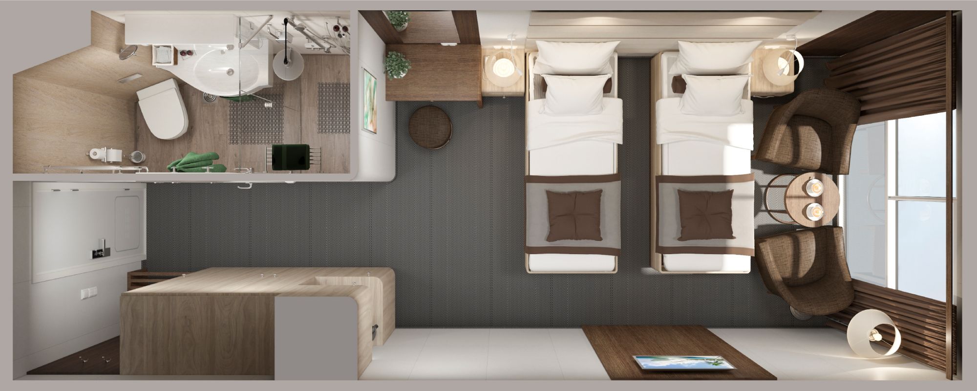 Двухместные каюты Делюкс, расположенные на шлюпочной палубе. В каюте: две односпальные кровати (сдвигаются), панорамные окна, спутниковое ТВ, шкаф для одежды, холодильник, розетки 220V, телефон, радио, фен, кофемашина, электрочайник, сейф, душ, санузел.