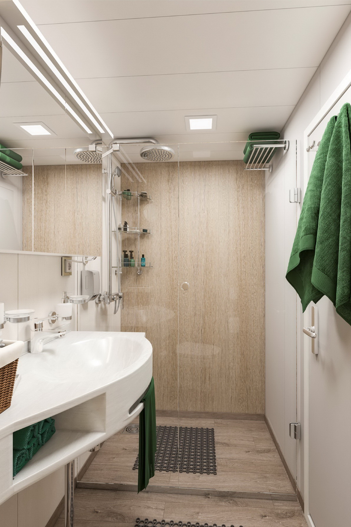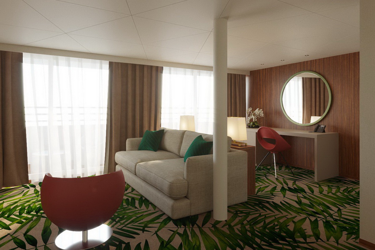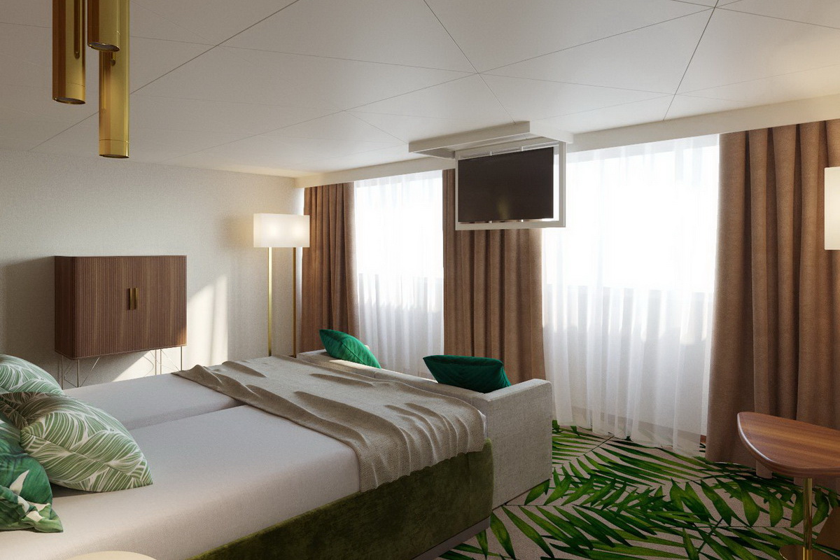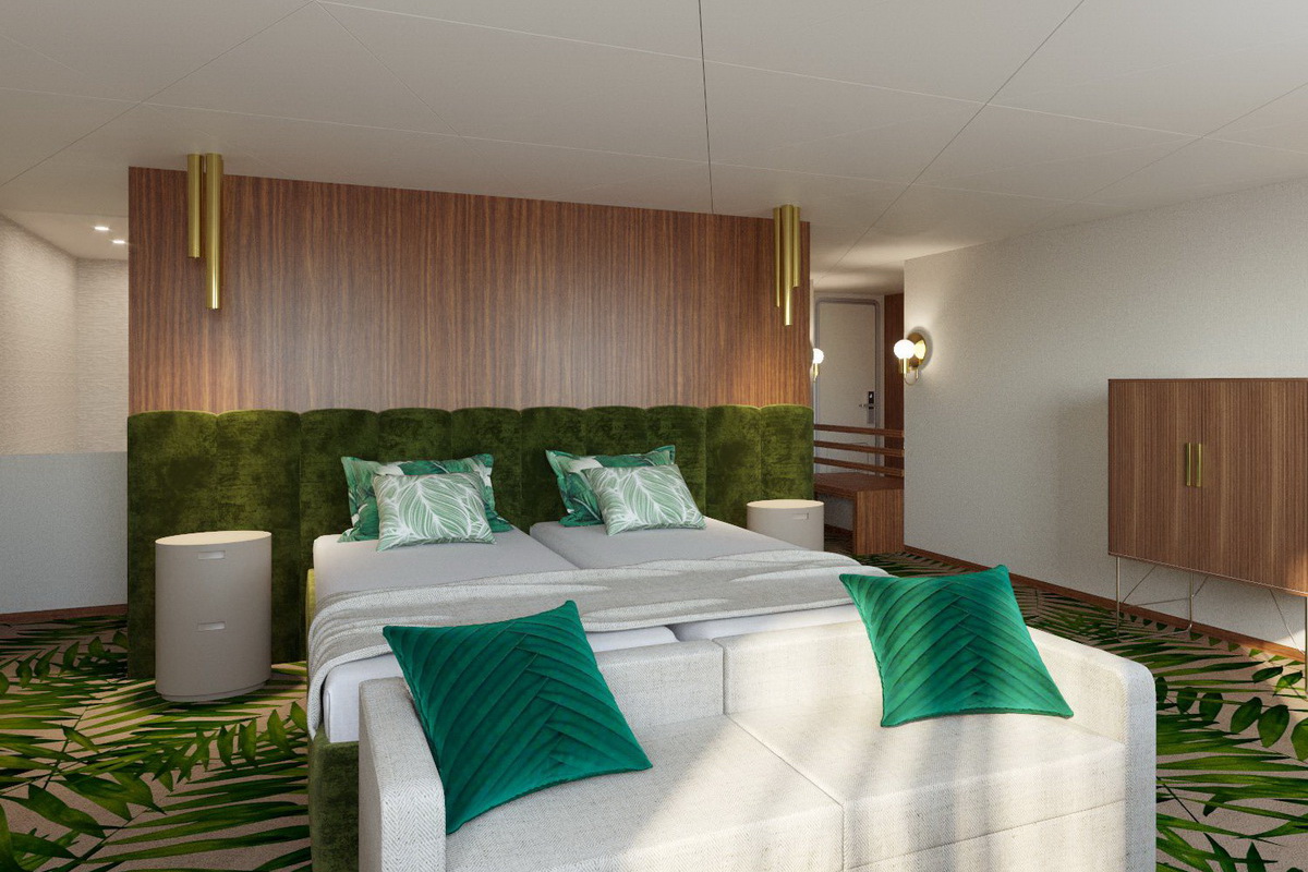 Двухместные каюты Делюкс, расположенные на шлюпочной палубе. В каюте: две односпальные кровати (сдвигаются), панорамные окна, спутниковое ТВ, шкаф для одежды, холодильник, розетки 220V, телефон, радио, фен, кофемашина, электрочайник, сейф, душ, санузел.