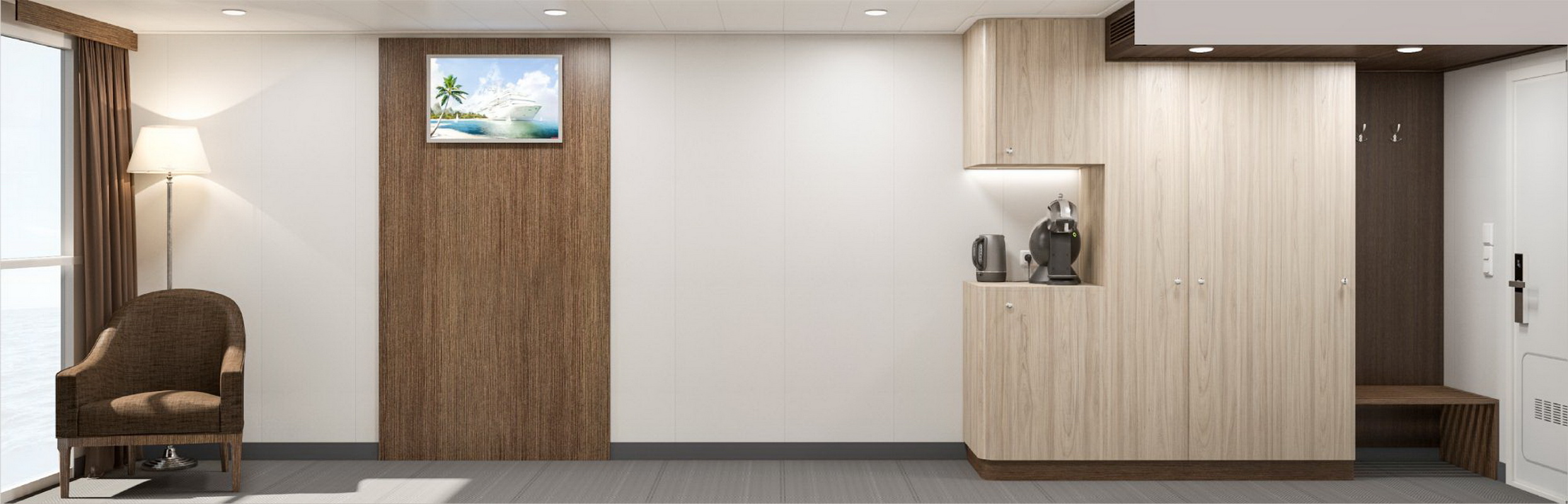 Во всех каютах: шкаф для одежды, радио, кондиционер, душ, санузел, обзорное окно, электророзетка 220V, холодильник, фен, телевизор, телефон, кофе-машина, сейф.