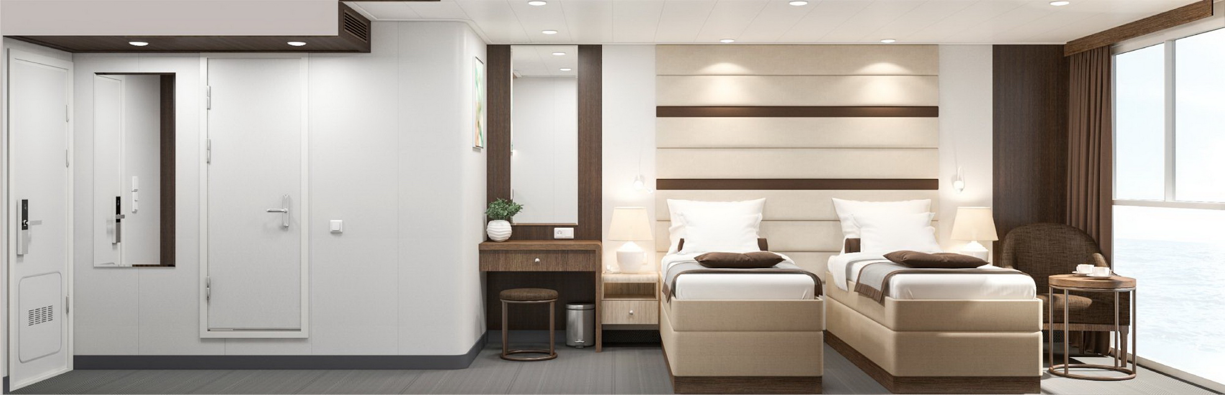 Двухместные каюты, расположенные на шлюпочной палубе. В каюте: две односпальные кровати (сдвигаются), панорамные окна, спутниковое ТВ, шкаф для одежды, холодильник, розетки 220V, телефон, радио, фен, сейф, кофемашина, электрочайник, душ, санузел. Площадь – 19 кв.м. Каюты №: 301, 302, 349, 350.