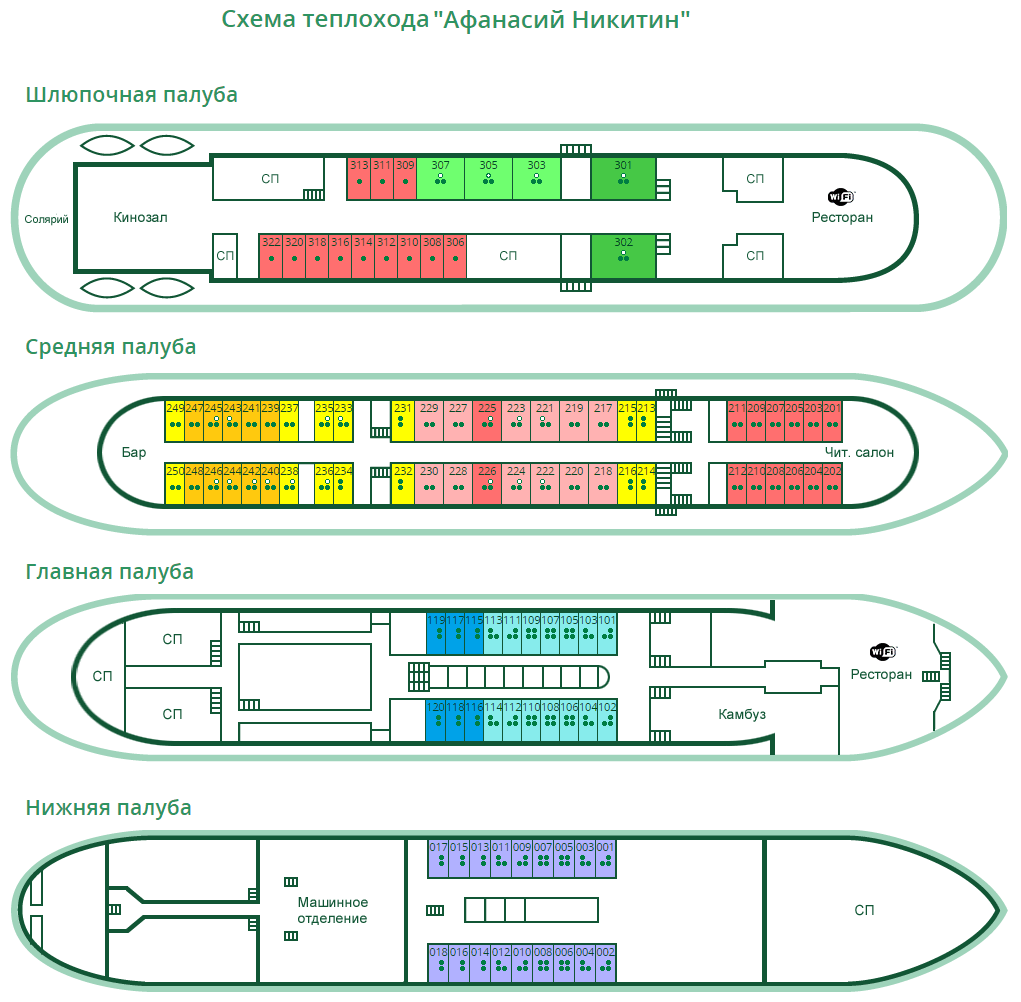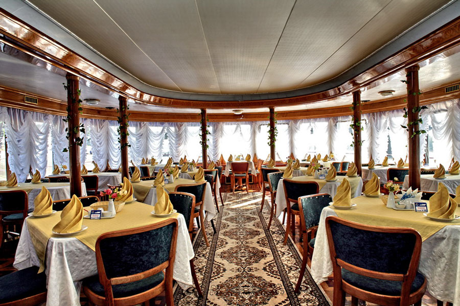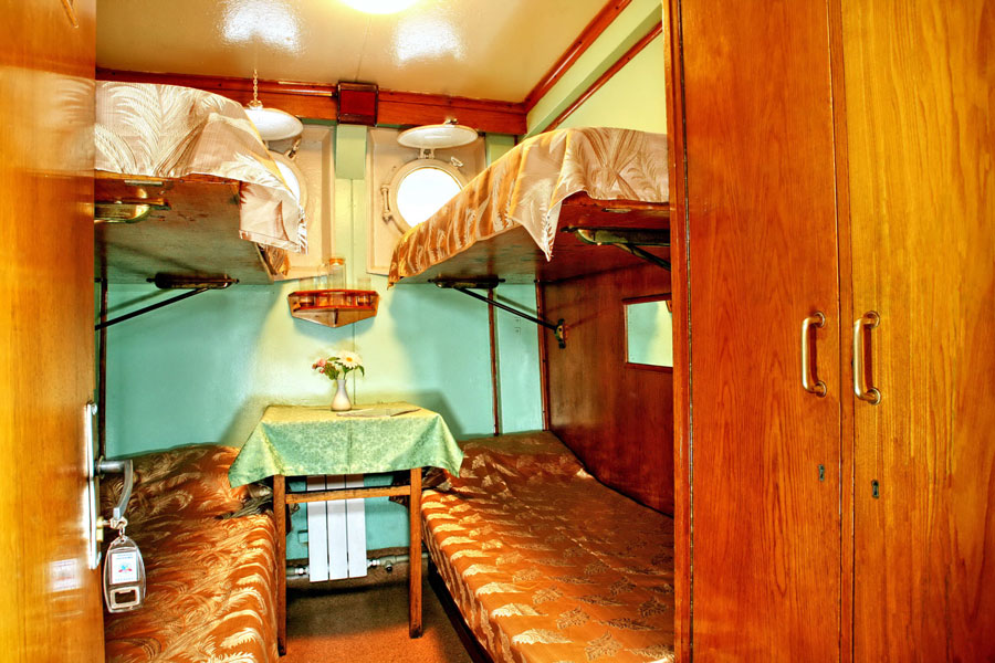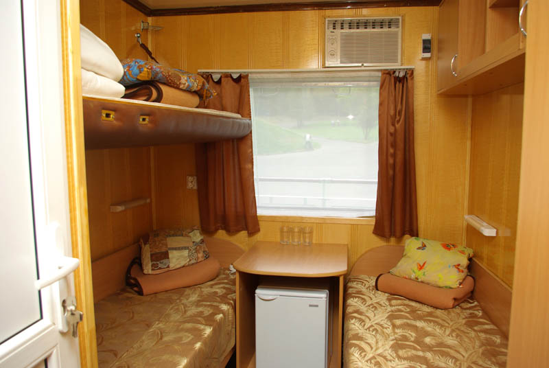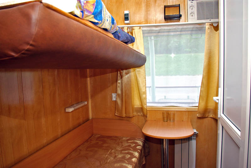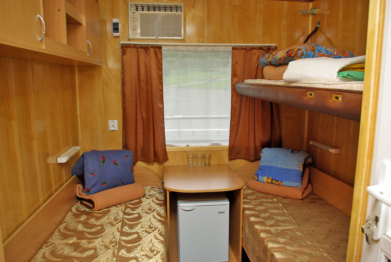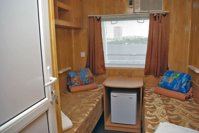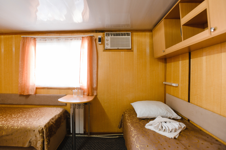 К вашим услугам: 2-х местные каюты без удобств, 3-х и 4-х местные каюты с умывальником (горячая и холодная вода), 1, 2-х, 3-х местные каюты с удобствами (душ, санузел, холодильник, кондиционер), каюты класса "Полулюкс" (душ, санузел, холодильник, кондиционер) и "Люкс" (все удобства, видеодвойка, кондиционер, раскладывающийся диван).