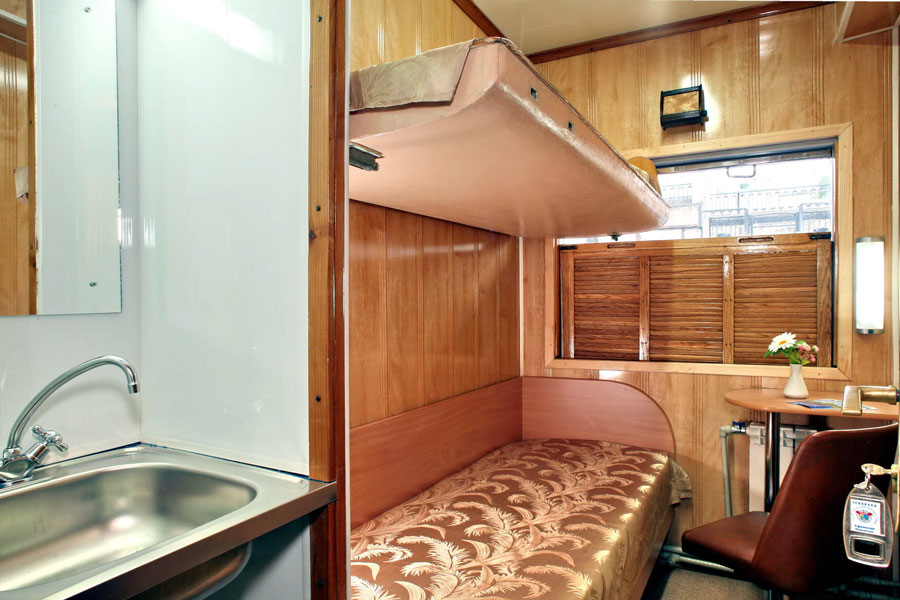 Двухместная двухъярусная каюта с умывальником на главной палубе. В каюте: умывальник с горячей и холодной водой, шкаф для одежды, радио. Каюты №: 115-120.