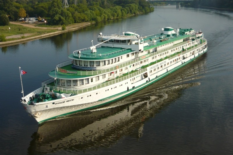 Трехпалубный теплоход "Афанасий Никитин". Теплоход обслуживает круизную пассажирскую линию Москва-Астрахань-Москва.