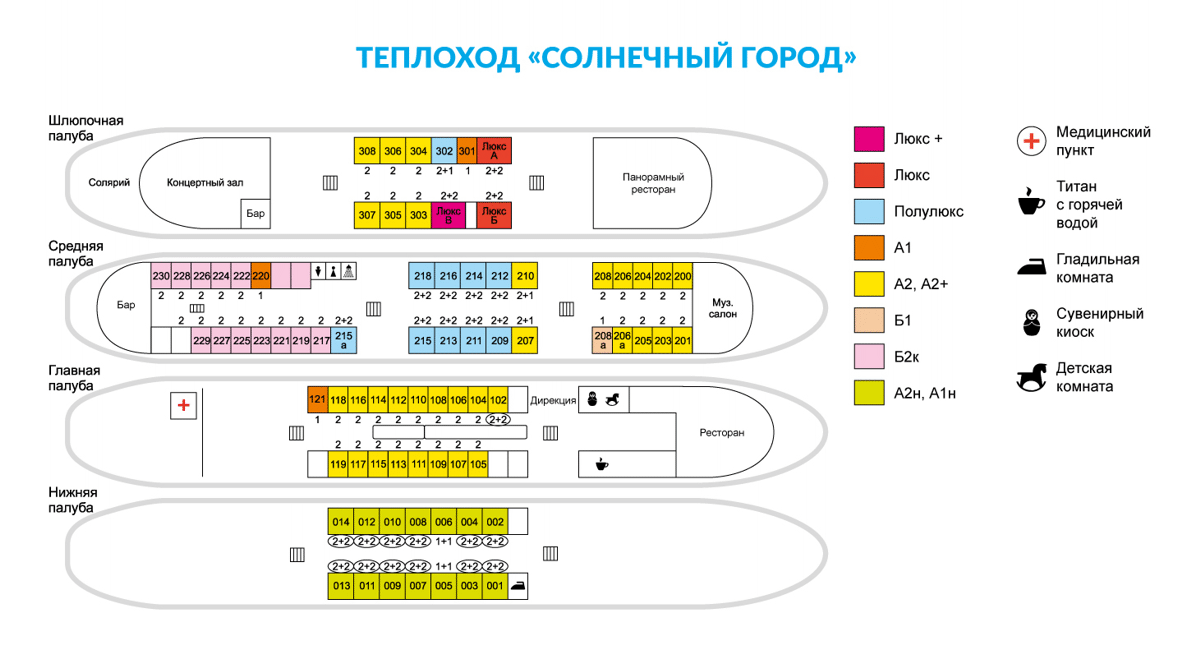 Каюта большой площади, повышенной комфортности со всеми удобствами (умывальник, туалет, душевая кабина, кондиционер), на шлюпочной палубе. В каюте: двуспальная кровать, раздвижной диван, шкаф, тумбочка, холодильник, телевизор со спутниковым и кабельным вещанием, фен, обзорные окна. Каюты: Люкс А, Люкс Б.