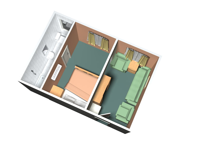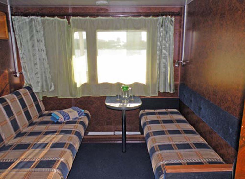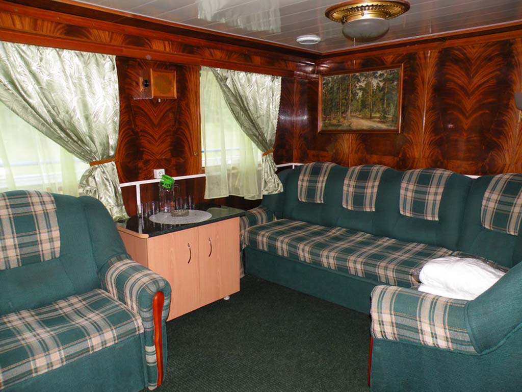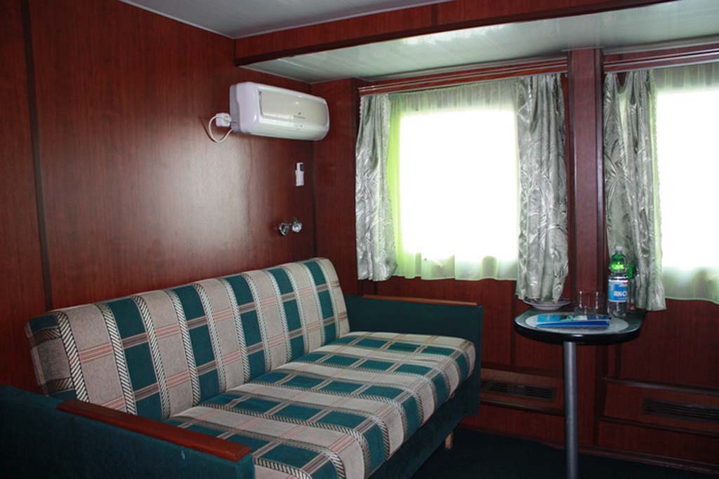 Двухместная каюта на средней палубе повышенной комфортности и повышенной площади, со всеми удобствами (умывальник, туалет, душ, кондиционер). В каюте: раскладной двуспальный диван, односпальный диван, шкаф, стол, холодильник, телевизор со спутниковым и кабельным вещанием, фен, два обзорных окна. Возможно размещение третьего человека на дополнительном месте (раскладной диван). Каюты №: 207, 210.