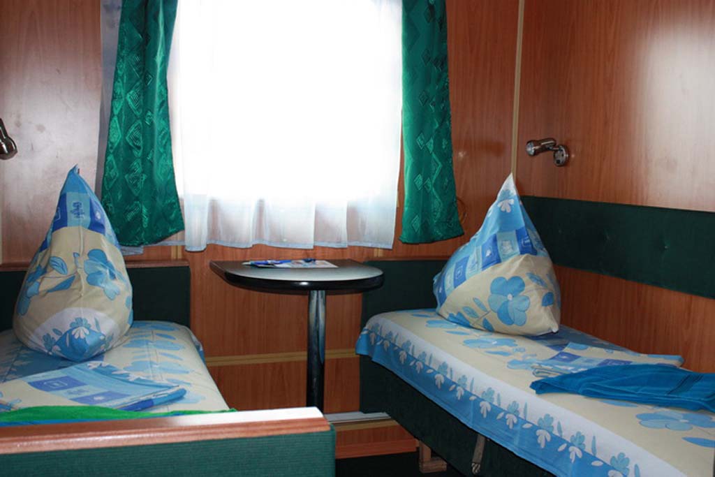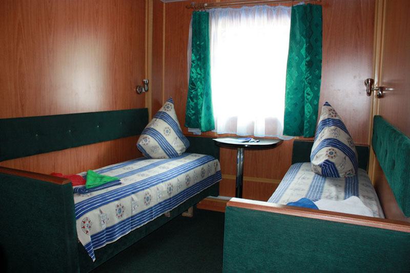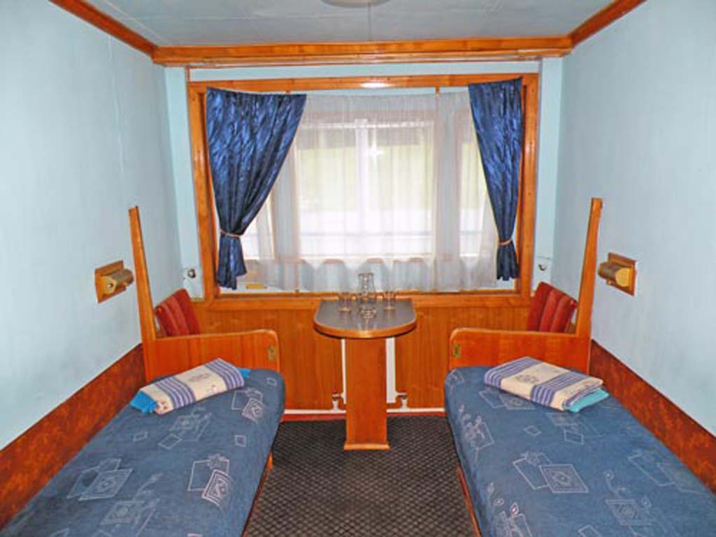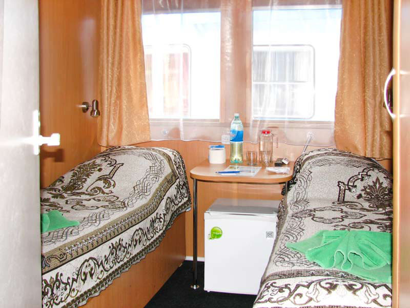 Двухместная одноярусная каюта на главной палубе со всеми удобствами (умывальник, туалет, душ, кондиционер). В каюте: два односпальных дивана (в каютах 102 и 103 также две полки верхнего расположения), шкаф, стол, холодильник, телевизор со спутниковым и кабельным вещанием, фен, обзорное окно. Каюты №: 102-119.