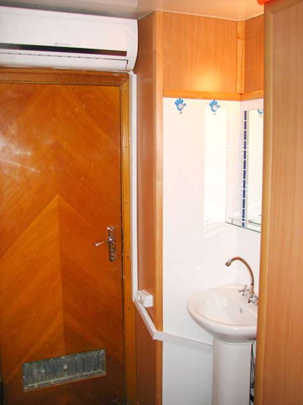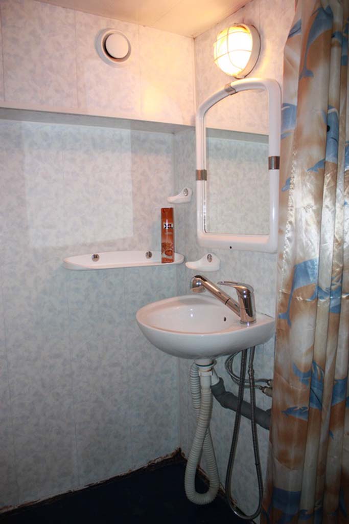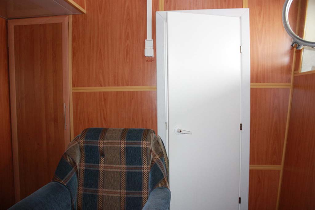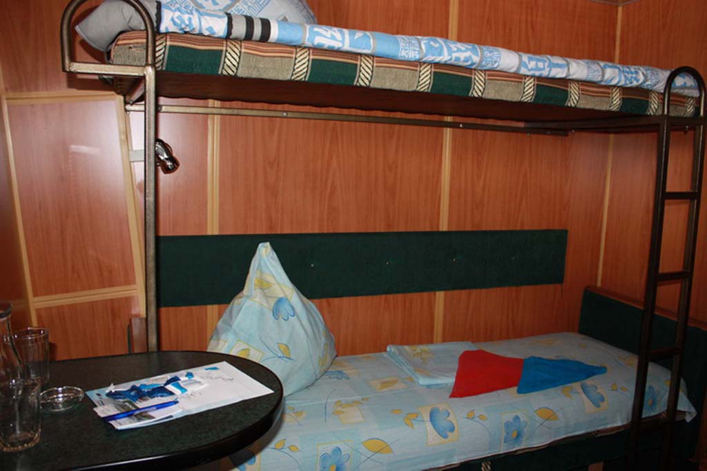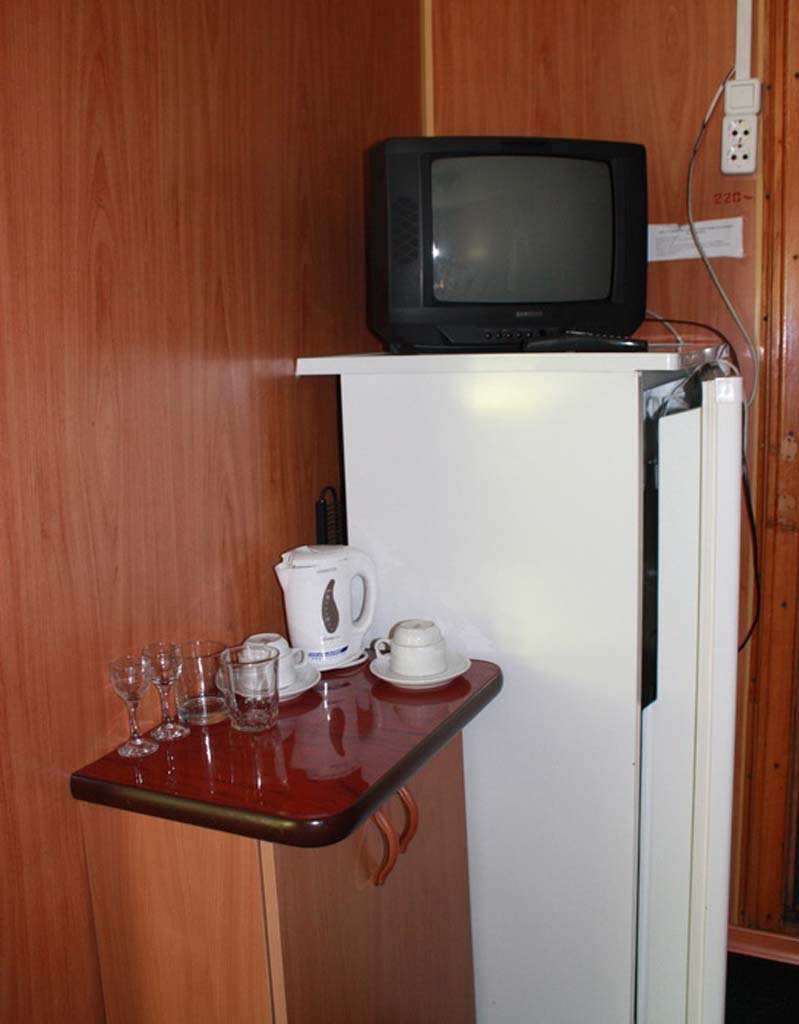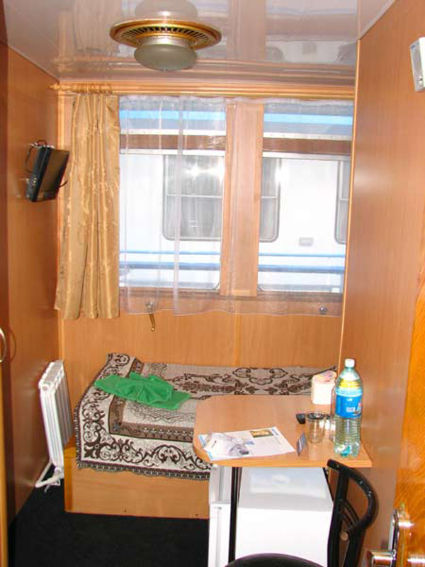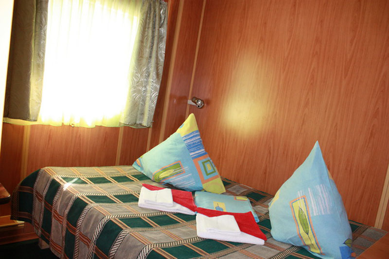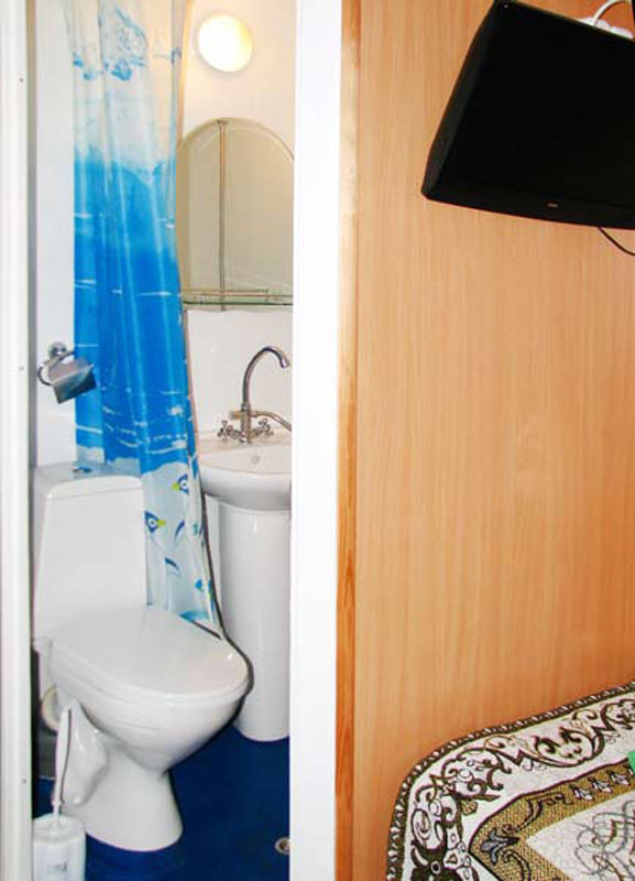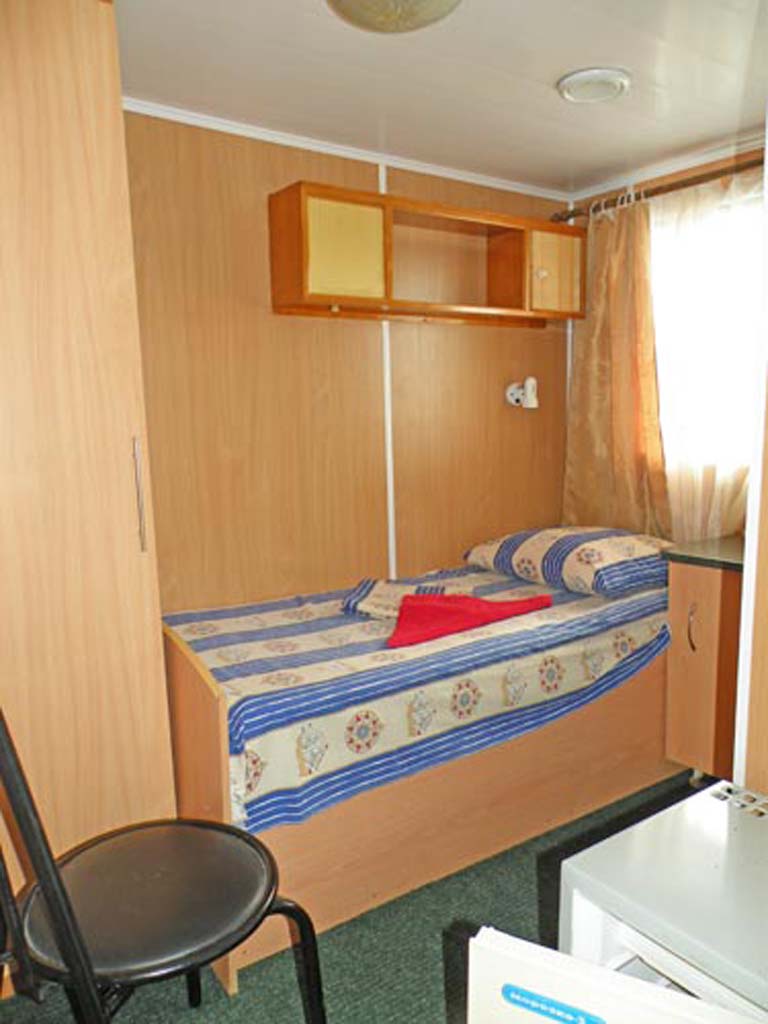Одноместная каюта на средней палубе со всеми удобствами (умывальник, туалет, душ, кондиционер). В каюте: односпальная кровать, шкаф, тумбочка, холодильник, телевизор со спутниковым и кабельным вещанием, фен, обзорное окно. Каюта № 220.