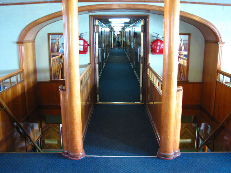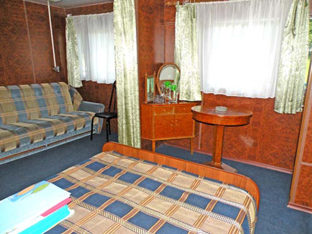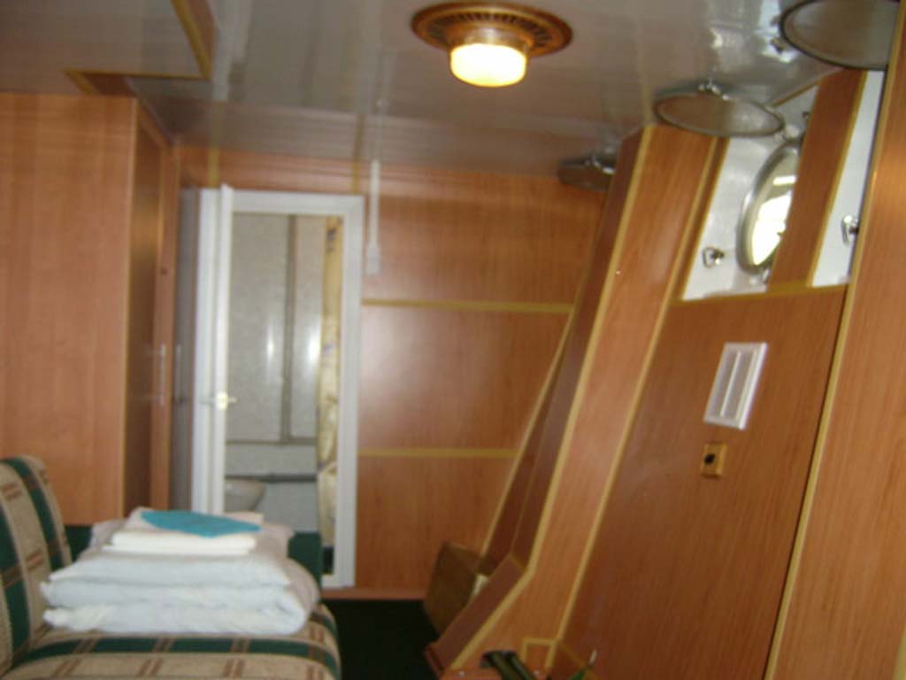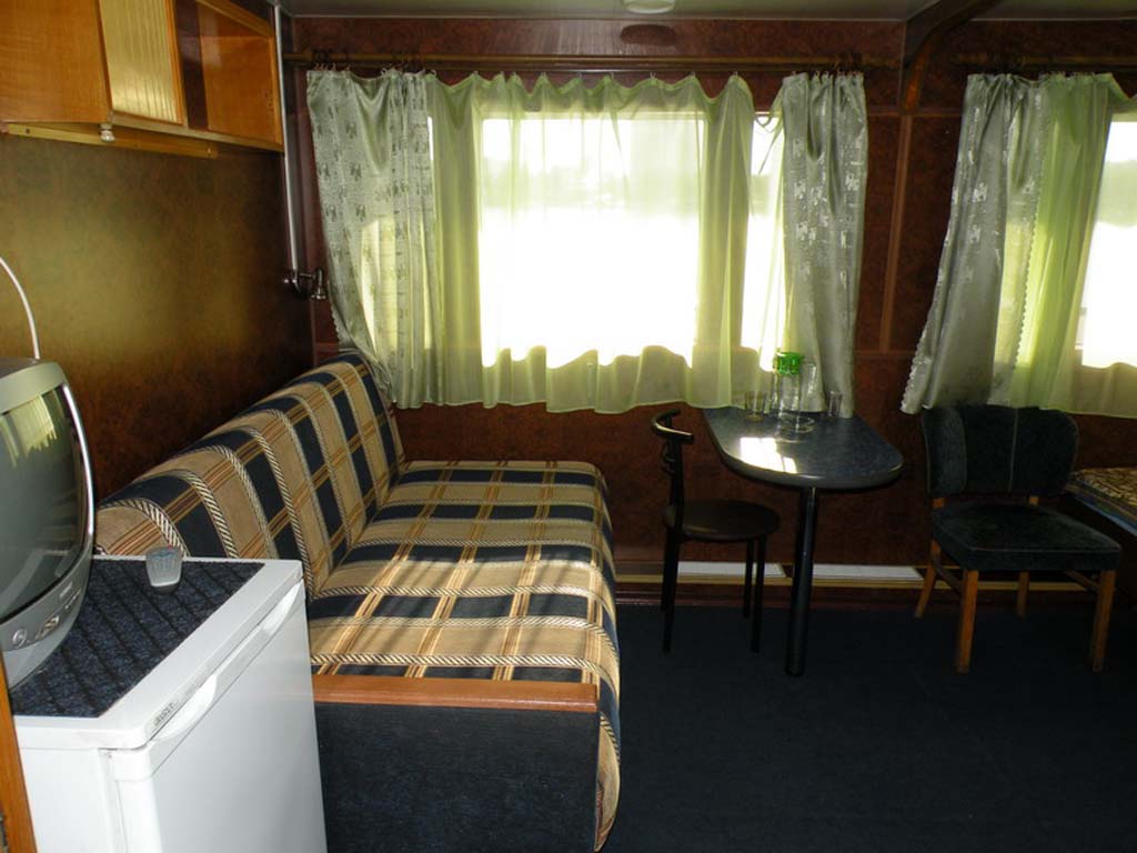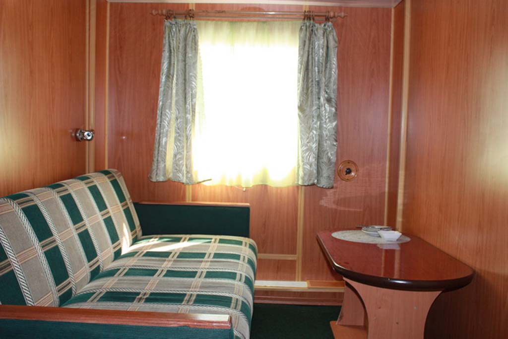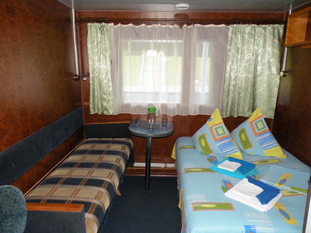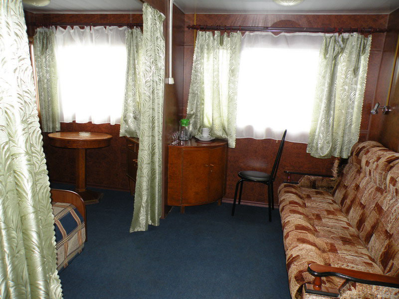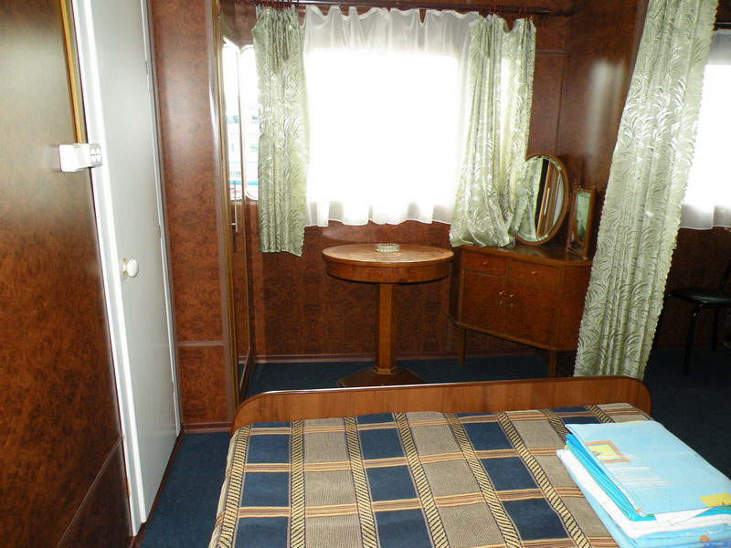 Каюта категории "Полулюкс" на шлюпочной палубе, однокомнатная повышенной площади, повышенной комфортности, со всеми удобствами (умывальник, туалет, душ, кондиционер). В каюте: 2 односпальные кровати, односпальный диван, шкаф, тумбочка, холодильник, телевизор со спутниковым и кабельным вещанием, фен, два обзорных окна. Каюта № 302.