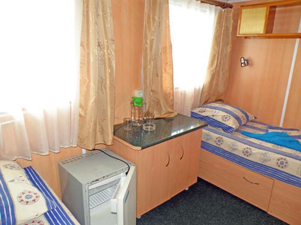 Одноместная каюта с одним дополнительным местом, на нижней палубе, рассчитана для размещения до 2-х человек, со всеми удобствами (умывальник, душ, туалет). В каюте: односпальный диван нижнего расположения, кресло-кровать, шкаф, стол, холодильник, телевизор со спутниковым и кабельным вещанием, фен, 4 иллюминатора. Каюты №: 005, 006.
